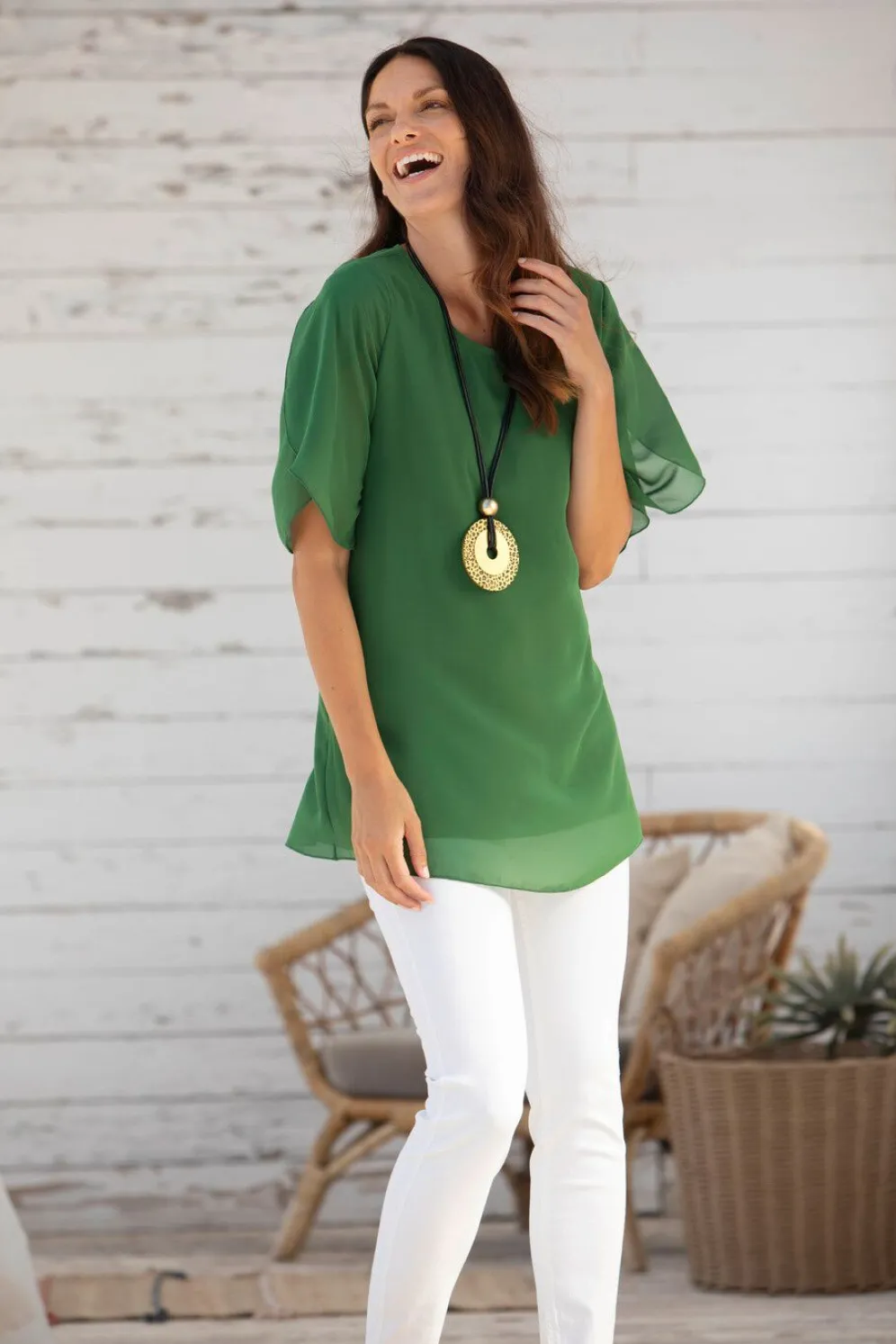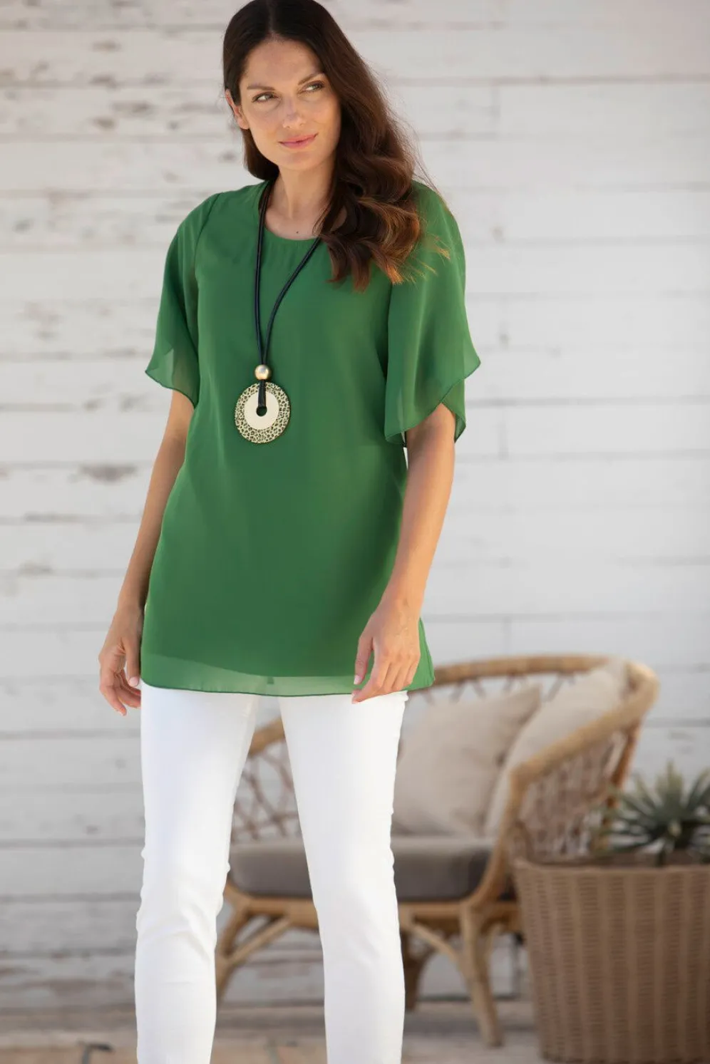 Ein wahrer Blickfang ist diese wunderschöne Tunika mit eingearbeitetem Top, rundem Halsausschnitt sowie kurzen Flügelärmeln.