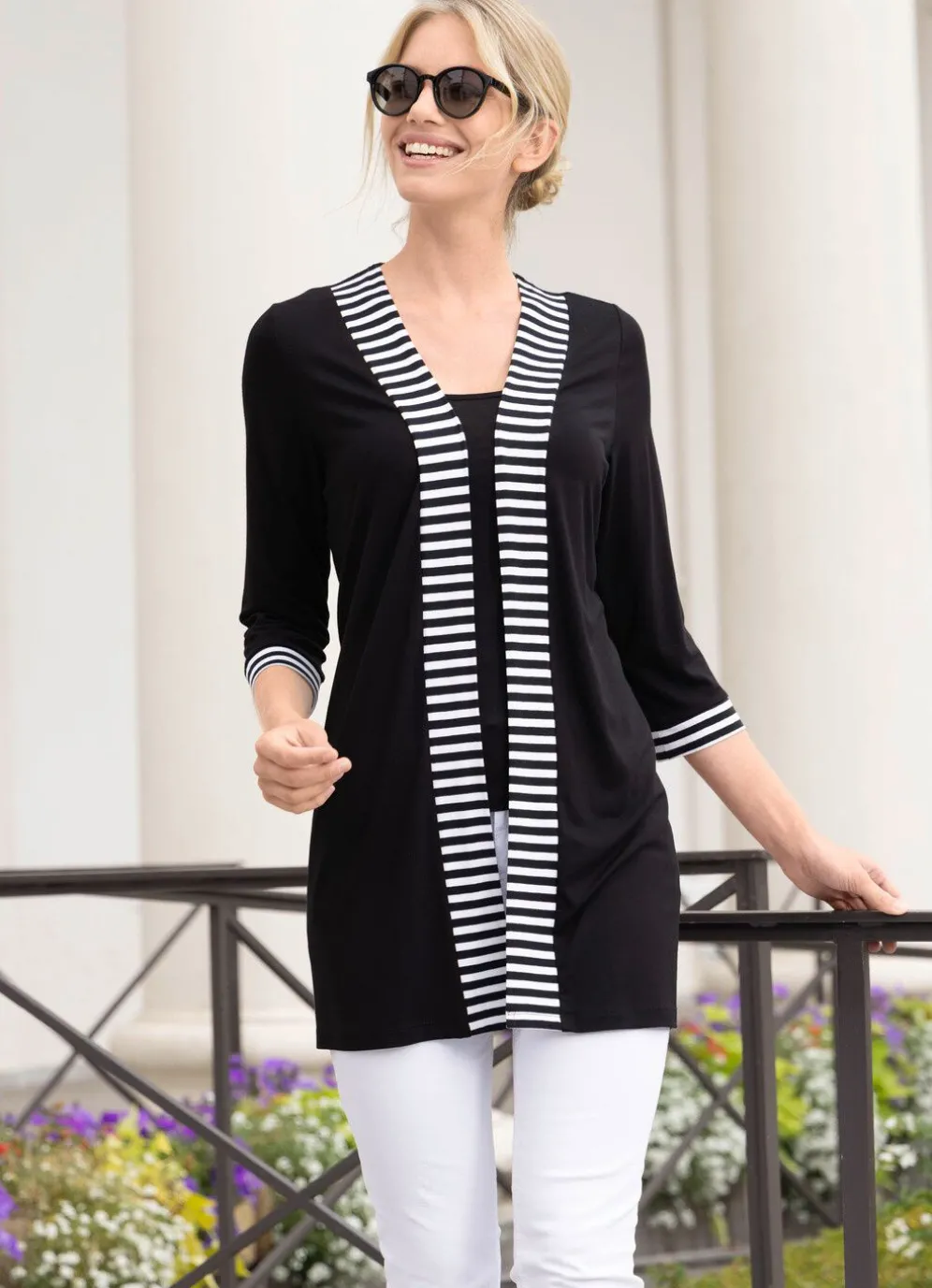 Bezauberndes, verschlussloses Chasuble in Schwarz-Weiß, mit tollem Streifenbesatz an der Verschlussleiste sowie an den Abschlüssen der 3/4-langen Ärmel.