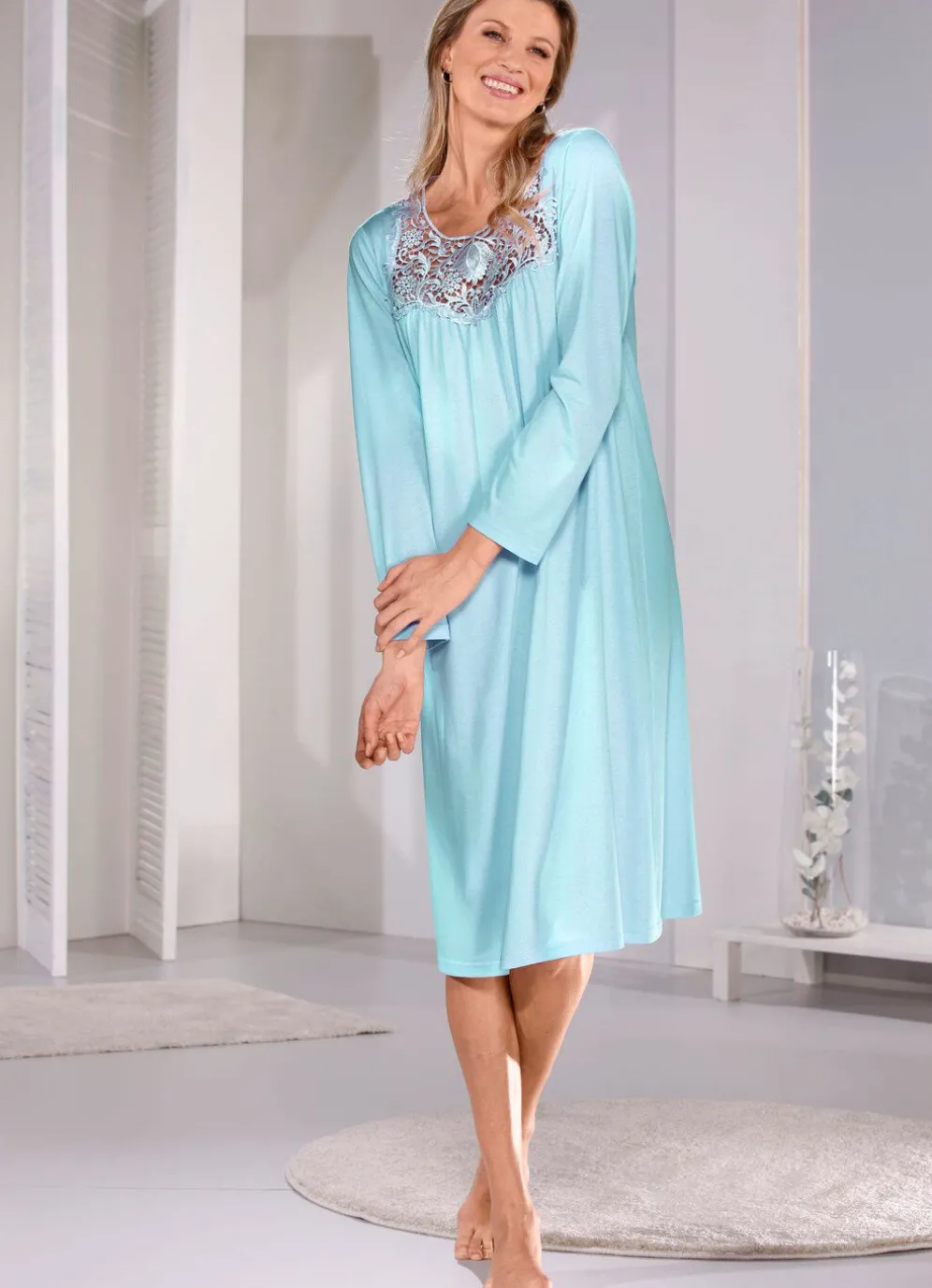 Wadenlanges Nachthemd mit großzügiger, floraler Stickereispitze und dezenten Raffungen