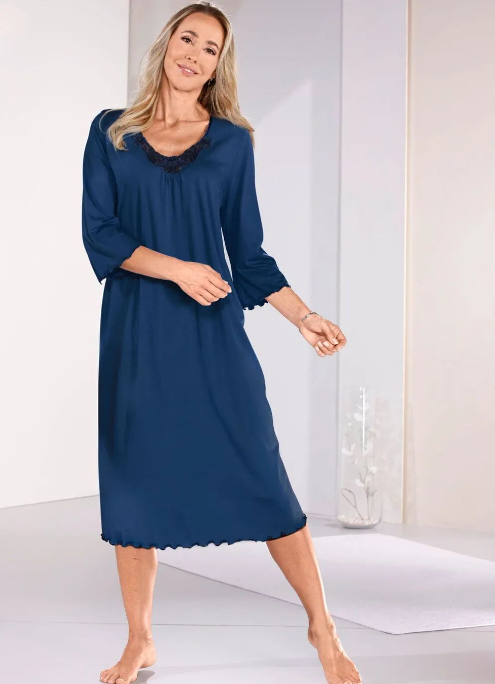 Wadenlanges Nachthemd mit Satinpaspel am Halsausschnitt, Tüllstickereispitze mit dezenten