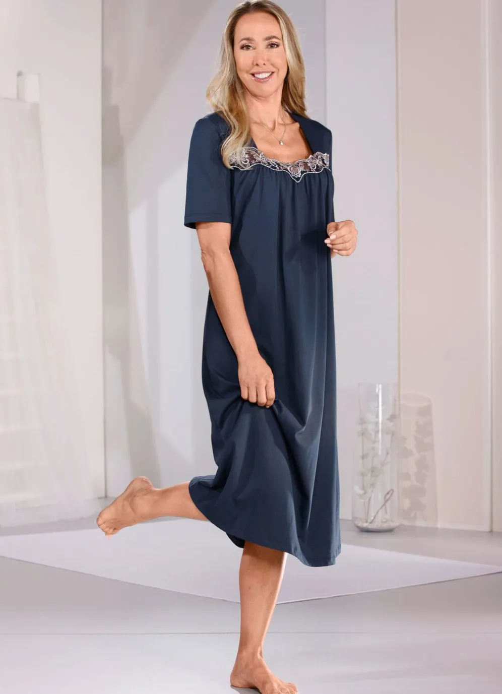 Wadenlanges Nachthemd mit Raffungen unterhalb der zarten Tüllstickereispitze im Vorderteil sowie