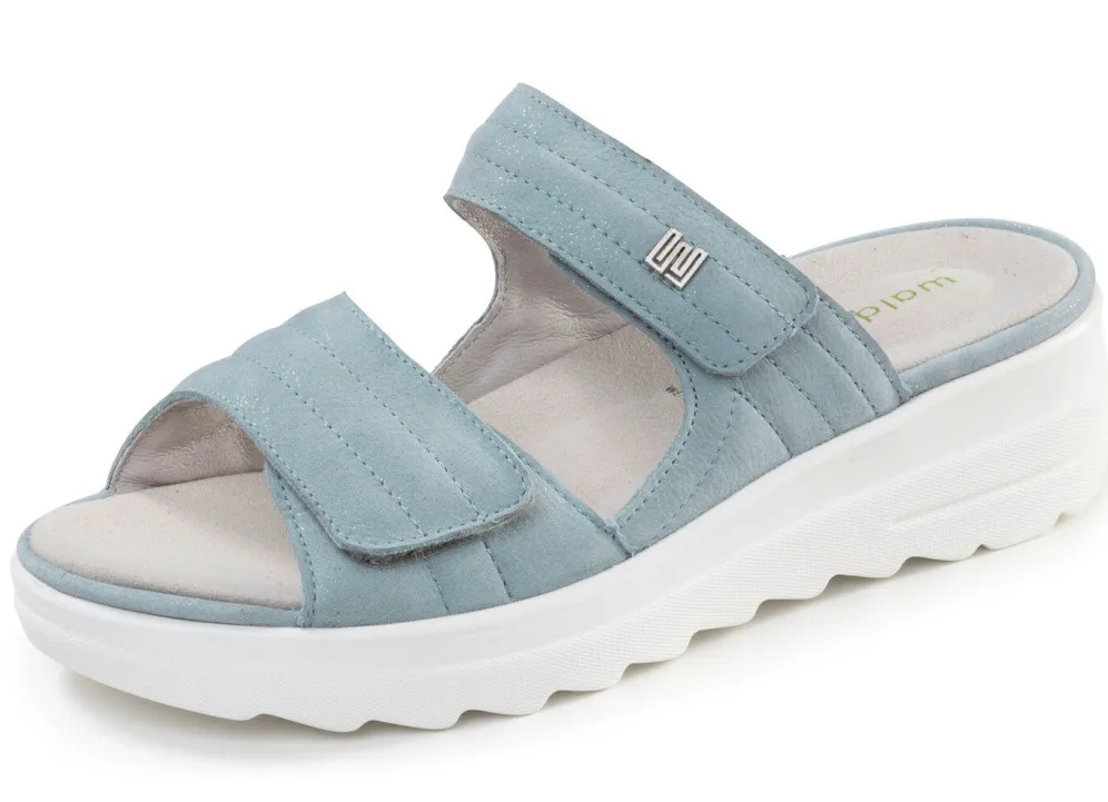 Pantoletten aus edlem, glänzendem Nubukleder mit zwei verstellbaren Klettspangen: Weite H, Lederfutter, herausnehmbares Fußbett, leichte PU-Luftpolster-Profilsohle sowie 25 mm Keilabsatz