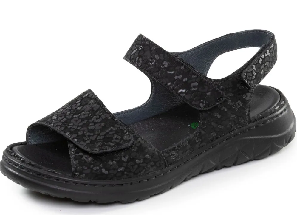 Schwarze Sandalen aus Nubukleder mit Leo-Prägung und drei verstellbaren Klettspangen: Weite H, Lederfutter, herausnehmbares Lederfußbett, leichte PU-Luftpolster-Profilsohle sowie 20 mm Keilabsatz