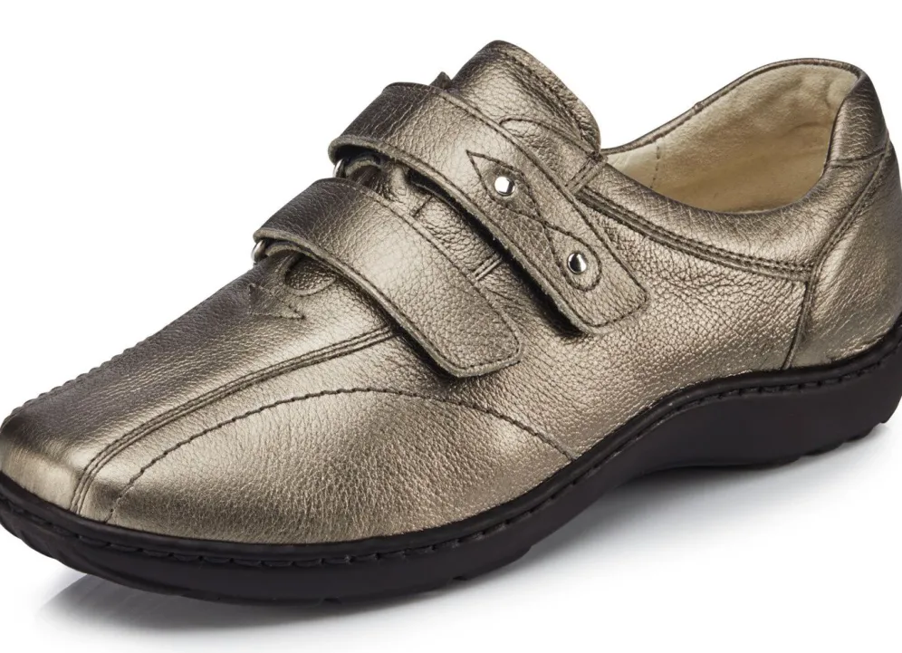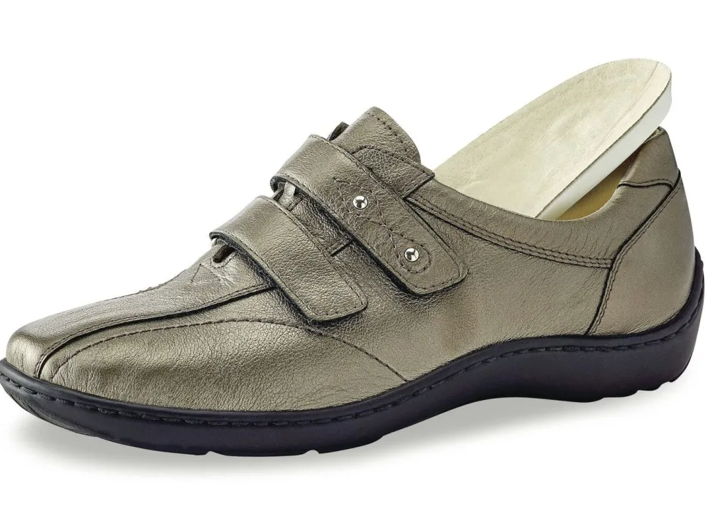 Slipper aus Rind-Nappaleder, in Weiß-Bunt aus floral bedrucktem Synthetikmaterial, in Burgund aus Rind-Knautschlackleder: Weite H, zwei verstellbare Klettspangen, ledergefüttertes Quartier, herausnehmbares Leder-Massagefußbett, leichte PU-Handnaht-Profilsohle sowie 20 mm Keilabsatz
