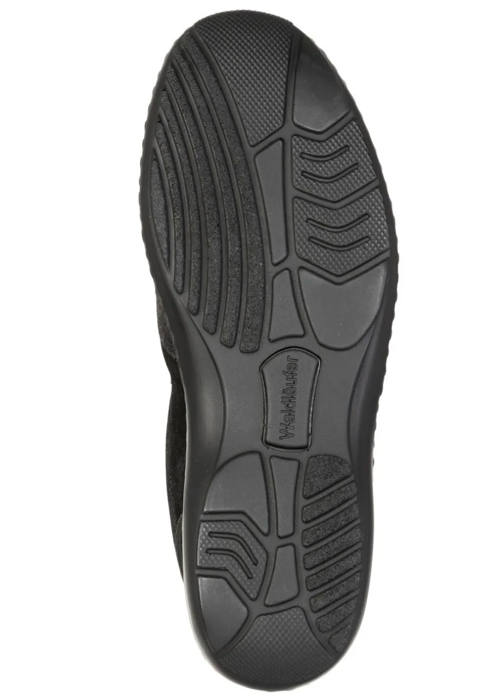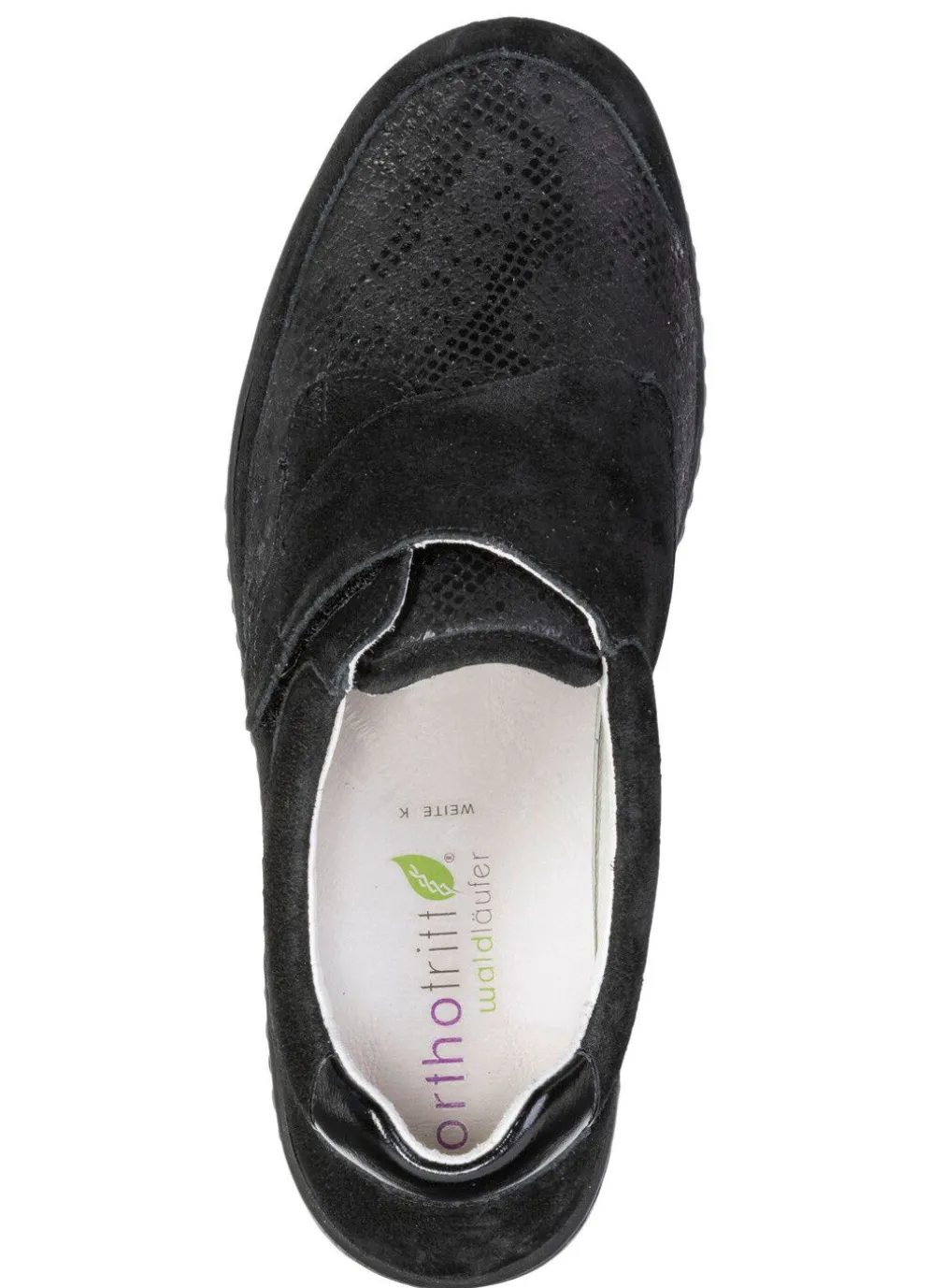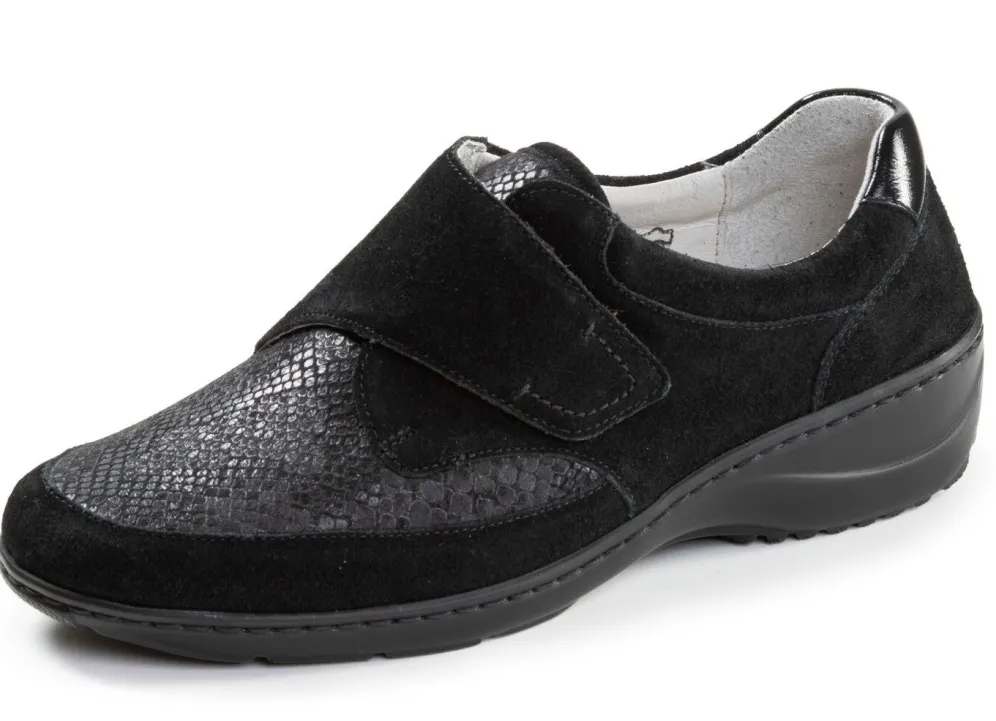 Slipper aus Veloursleder und dezent geprägtem Elastikmaterial im Ballenbereich, mit Klettspange: Weite K, Lackeinsatz, ledergefüttertes Quartier, herausnehmbares Lederfußbett, superleichte PU-Profilsohle sowie 30 mm Keilabsatz