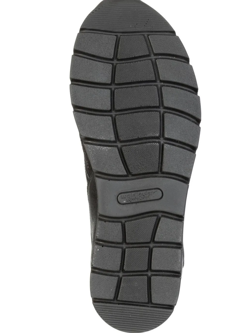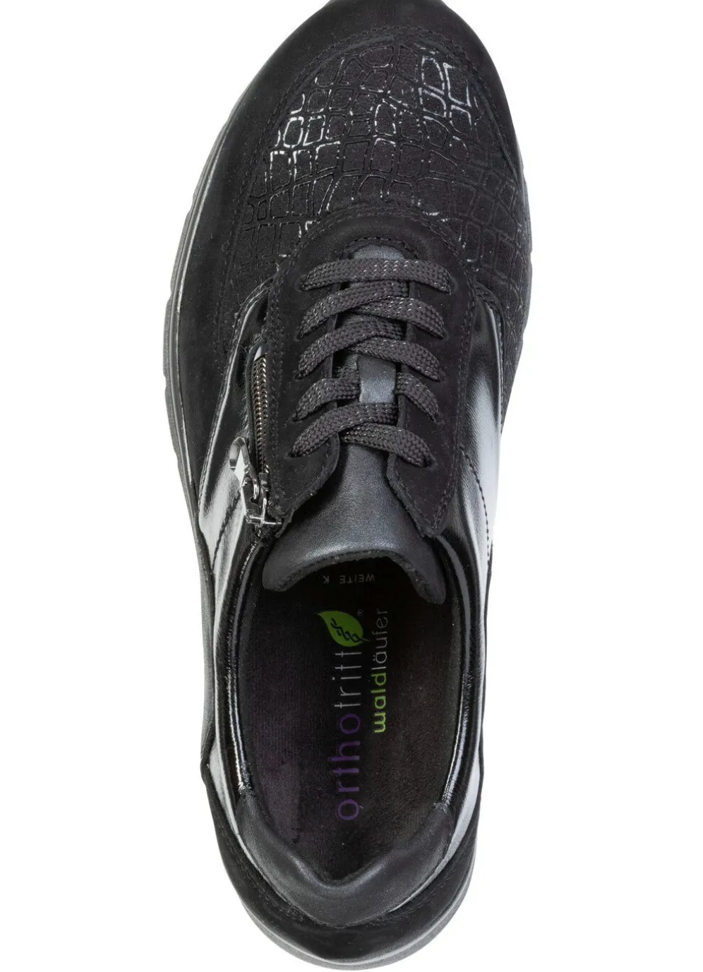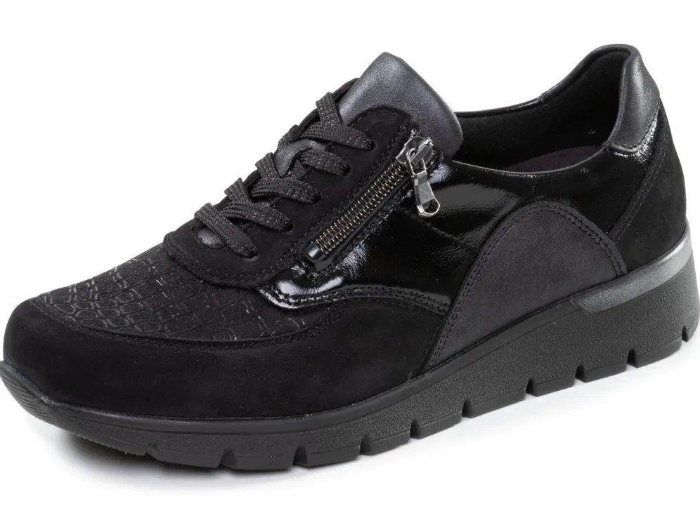 Schwarze Sneaker im Leder-Materialmix mit geprägtem Elastikmaterial: Weite K, Schnürung, praktischer Seitenreißverschluss, Futter und herausnehmbares Fußbett aus Textil, leichte PU-Luftpolster-Profilsohle sowie 25 mm Keilabsatz
