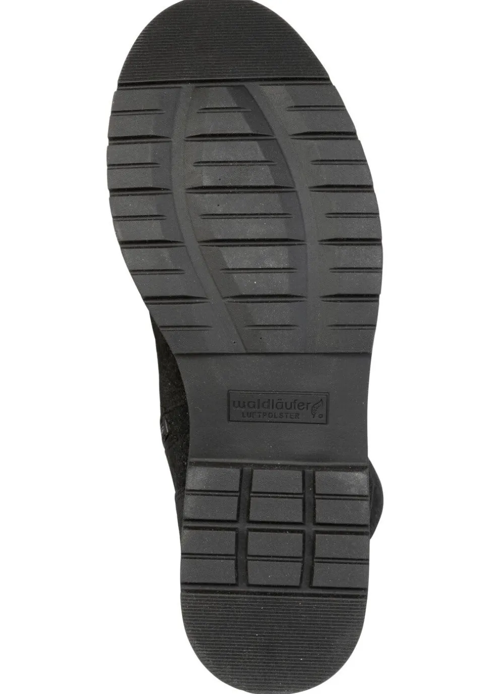 Stiefeletten in Schwarz aus geprägtem Veloursleder, mit dezentem Schimmer: Weite G, Schnürung, praktischer Innenreißverschluss, ledergefüttertes Quartier, herausnehmbares Lederfußbett, leichte TR-Profilsohle sowie 20 mm Absatz. Schafthöhe ca. 15 cm