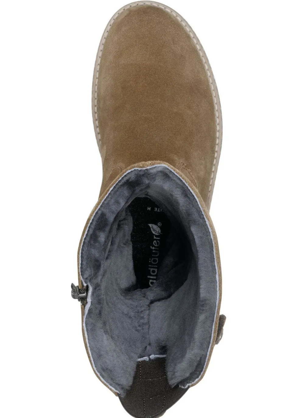 Warmer Stiefel aus bestem Rind-Veloursleder, mit Zierschnalle und rückwärtigen Gummizügen mit Klettspange: in Weite H, Innenreißverschluss, echtes, kuscheliges Lammfellfutter, herausnehmbares Fußbett, TR-Luftpolstersohle sowie 15 mm Keilabsatz. Schafthöhe ca. 32 cm, Wadenweite ca. 38 cm