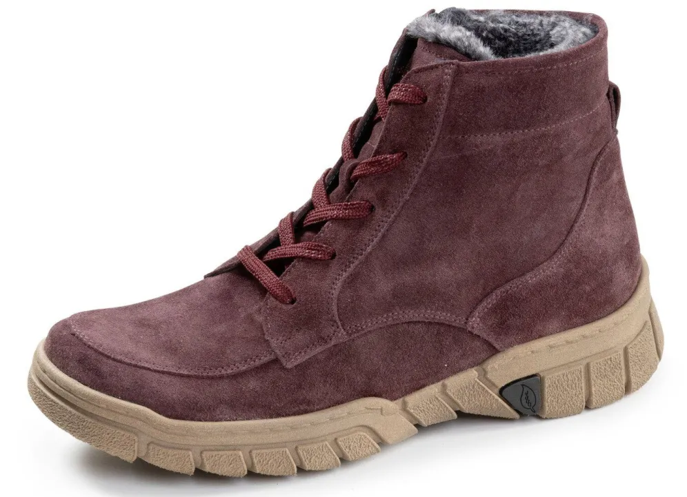 Stiefeletten aus weichem Veloursleder, mit Schnürung und praktischem Innenreißverschluss: Weite H, Warmfutter aus 100% Polyester, herausnehmbares Filz-Fußbett, leichte Synthetik-Luftpolster-Profilsohle sowie 15 mm Keilabsatz. Schafthöhe ca. 12 cm
