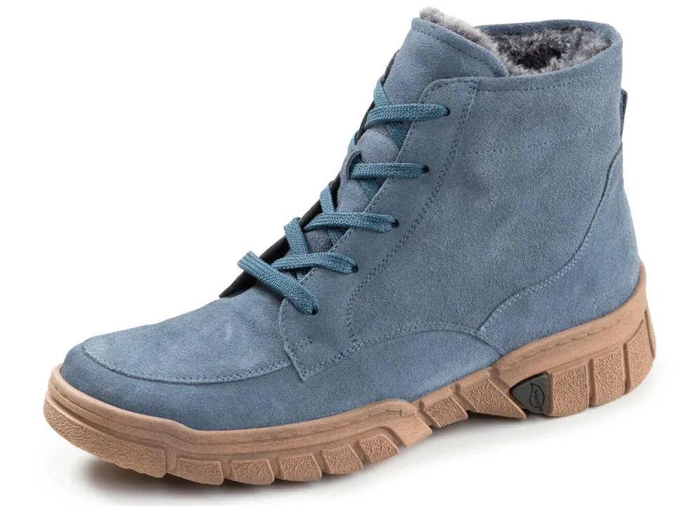 Stiefeletten aus weichem Veloursleder, mit Schnürung und praktischem Innenreißverschluss: Weite H, Warmfutter aus 100% Polyester, herausnehmbares Filz-Fußbett, leichte Synthetik-Luftpolster-Profilsohle sowie 15 mm Keilabsatz. Schafthöhe ca. 12 cm