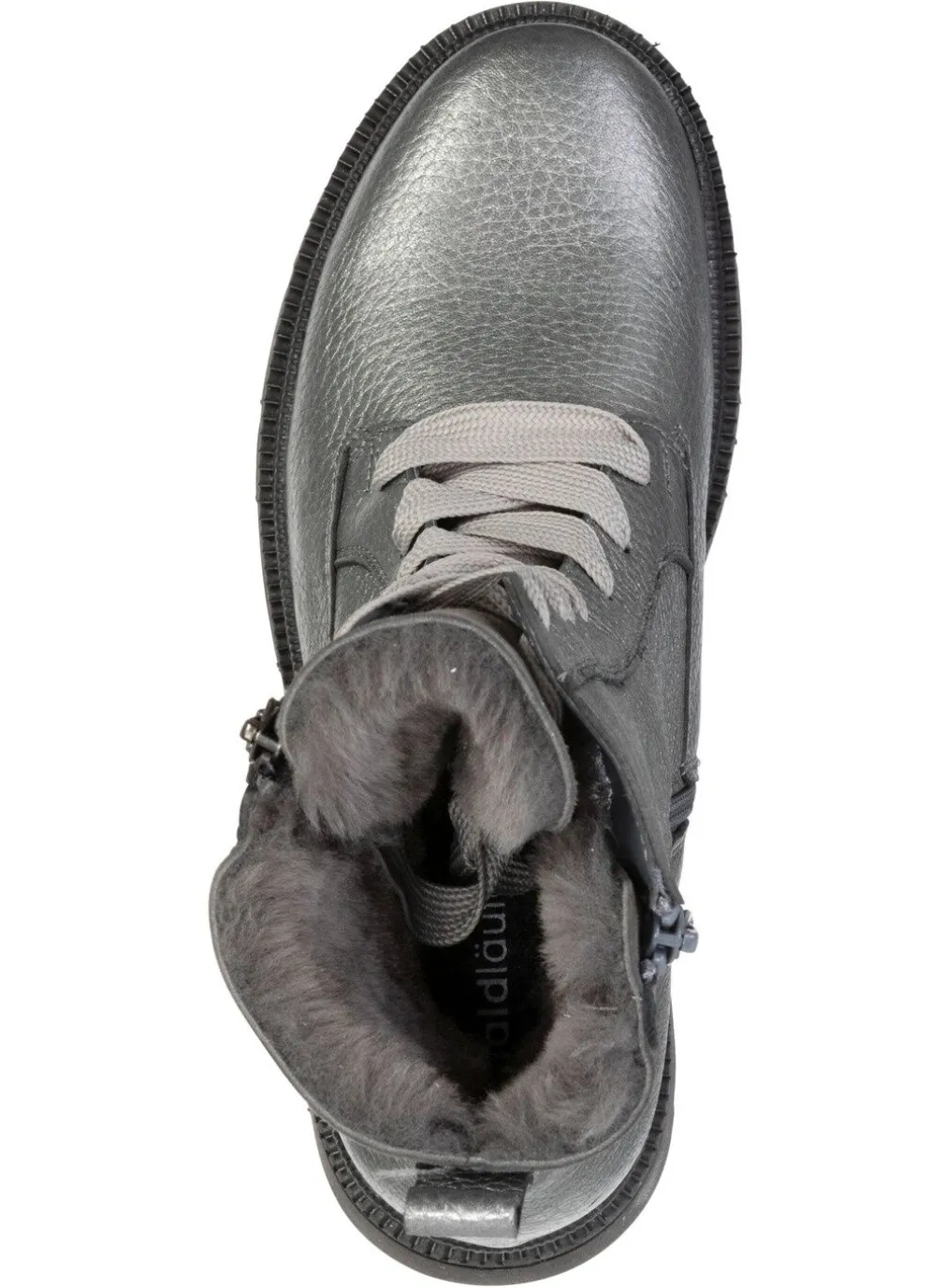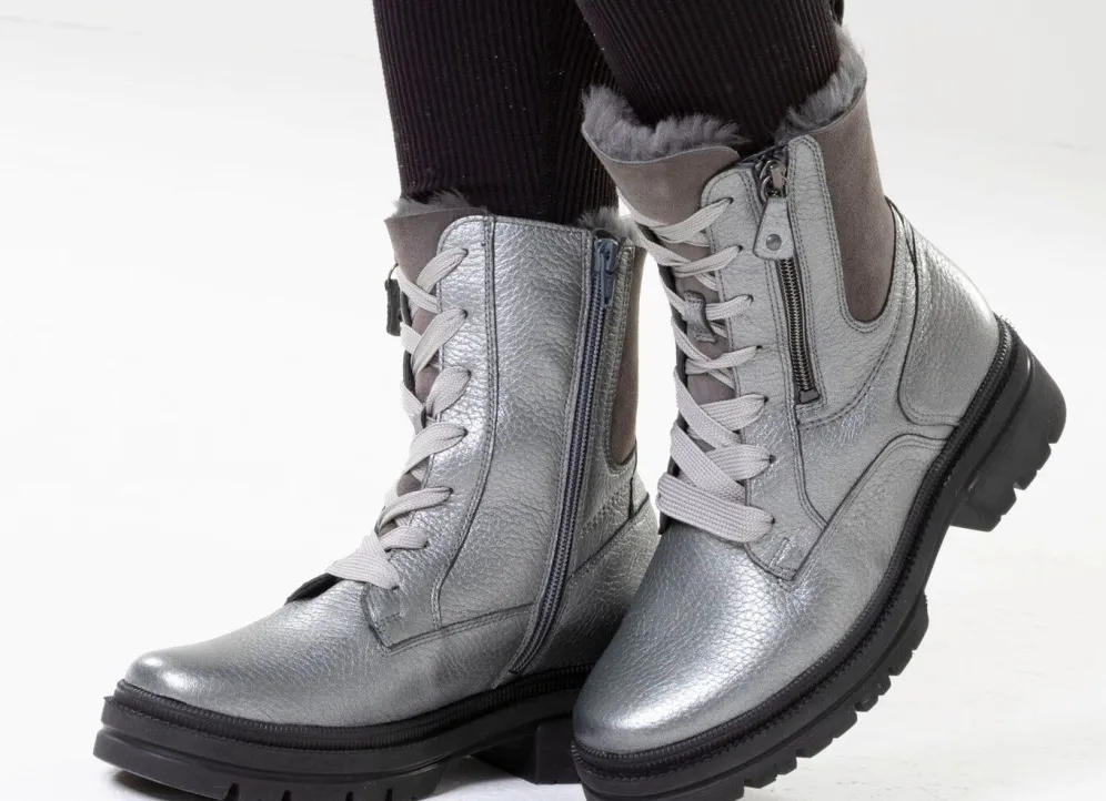 Stiefeletten aus genarbtem Hirsch-Nappaleder und Veloursleder, mit kuscheligem Lammfellkragen: Weite H, Schnürung, zwei Seitenreißverschlüsse, Warmfutter aus 100% Polyester, herausnehmbares Filz-Fußbett, leichte PU-Luftpolster-Profilsohle sowie 20 mm Absatz. Schafthöhe ca. 17 cm