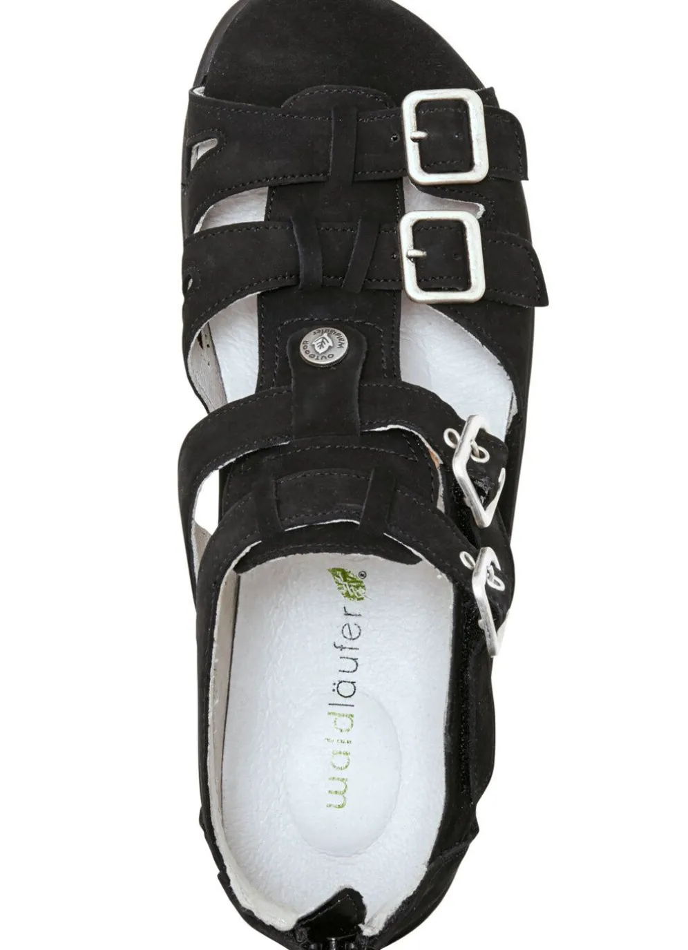 Sandale aus edlem Rind-Metallicleder, in Schwarz aus Rind-Nubukleder: Weite H, vier verstellbare Schließen, davon zwei mit Klettverschluss, Fersen-Reißverschluss, Lederfutter, herausnehmbares Lederfußbett, leichte PU-Riffelsohle sowie 25 mm Keilabsatz