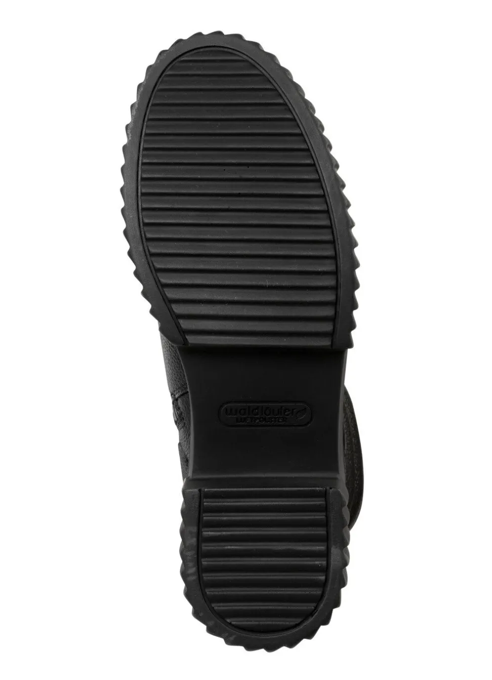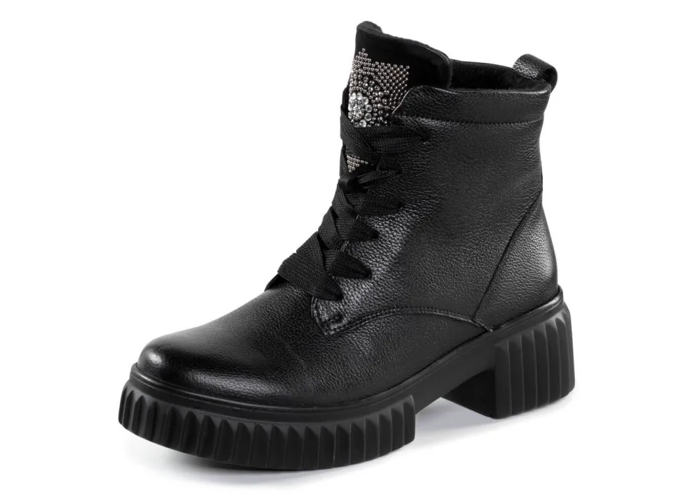 Schwarzer Schnür-Bootie aus genarbtem Nappaleder: Weite H, Zunge aus Nubukleder mit effektvollen Glitzer-Steinchen, Innenreißverschluss, wärmendes Textilfutter, herausnehmbares Filz-Fußbett, leichte PU-Luftpolster-Riffelsohle mit 30 mm Plateauboden sowie 50 mm Absatz. Schafthöhe ca. 14 cm