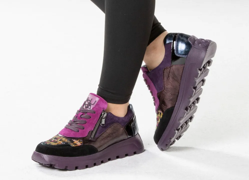 Bunter Schnür-Sneaker in Lila aus Velours-, Nappa- und Lackleder, mit Textilmaterial kombiniert: Weite H, seitlicher Reißverschluss, ledergefüttertes Quartier, herausnehmbares Lederfußbett, superleichte EVA-Profilsohle sowie 15 mm Keilabsatz