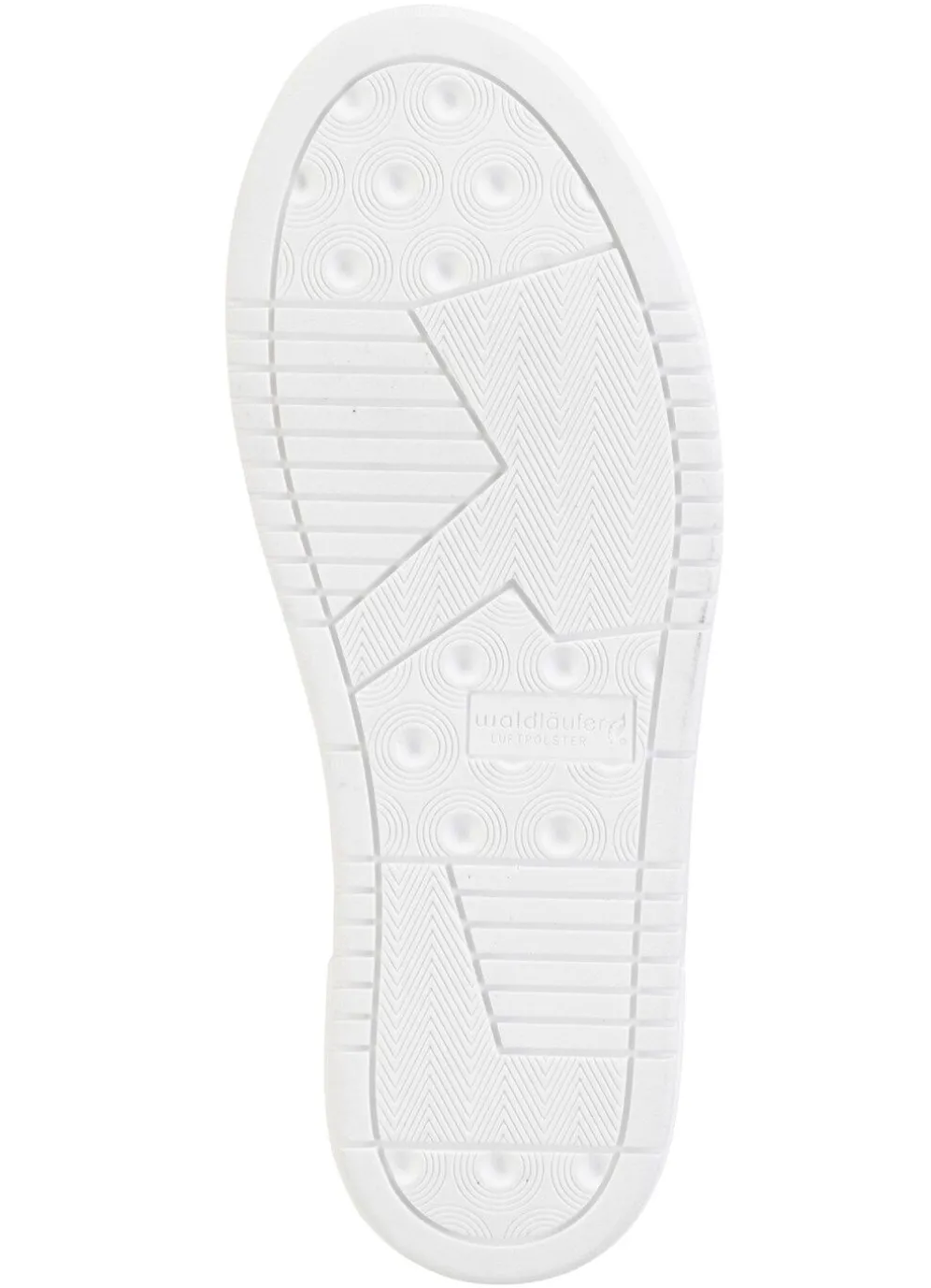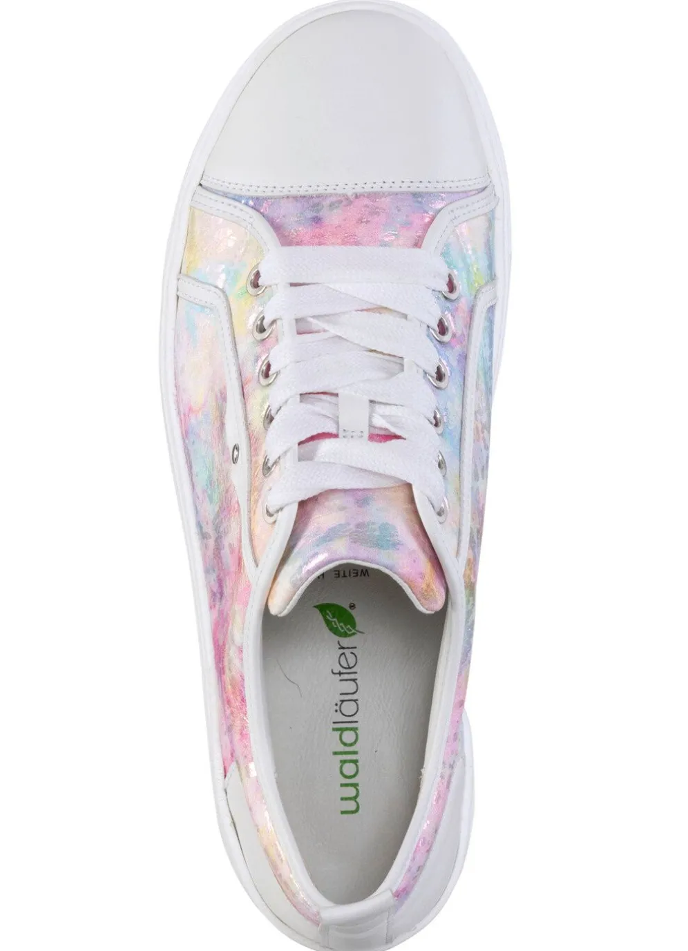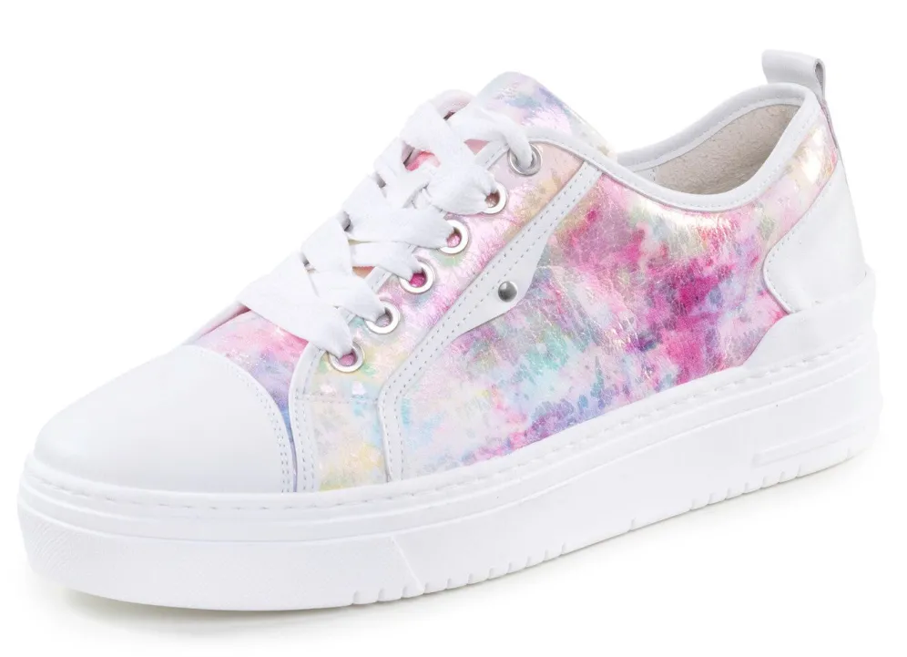 Trendiger Schnür-Sneaker aus verspielt bedrucktem Textilmaterial, bei Weiß-Multicolor mit Nappaleder, bei Jeans mit Nubukleder kombiniert: Weite H, ledergefüttertes Quartier, herausnehmbares Lederfußbett, leichte PU-Luftpolstersohle sowie 10 mm Keilabsatz