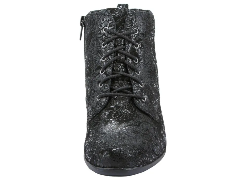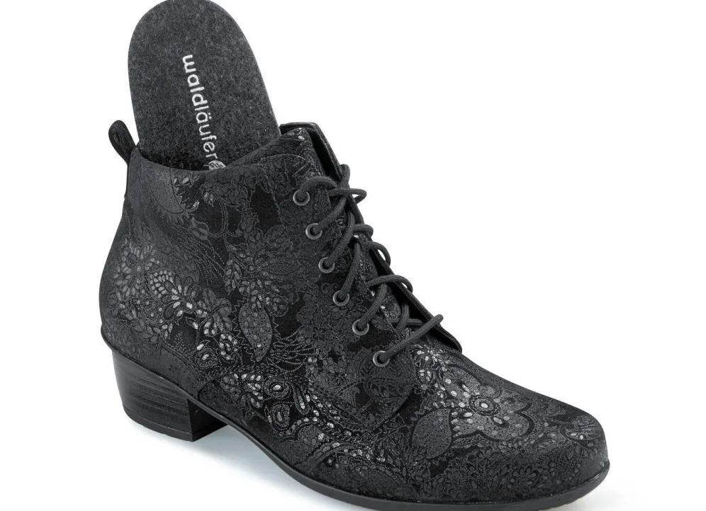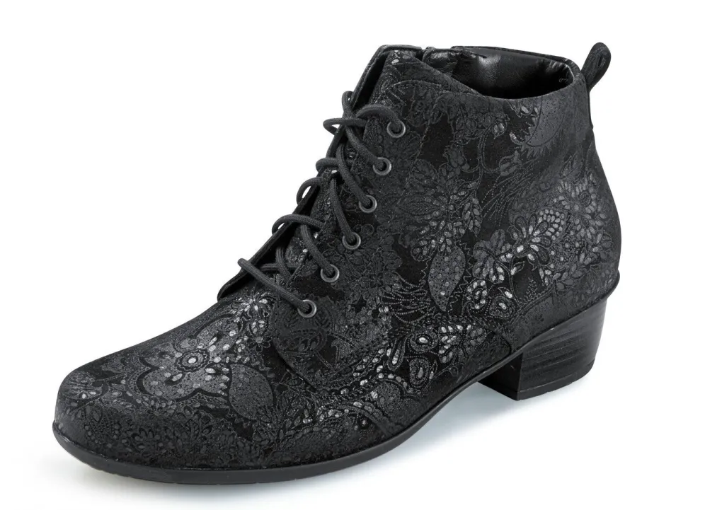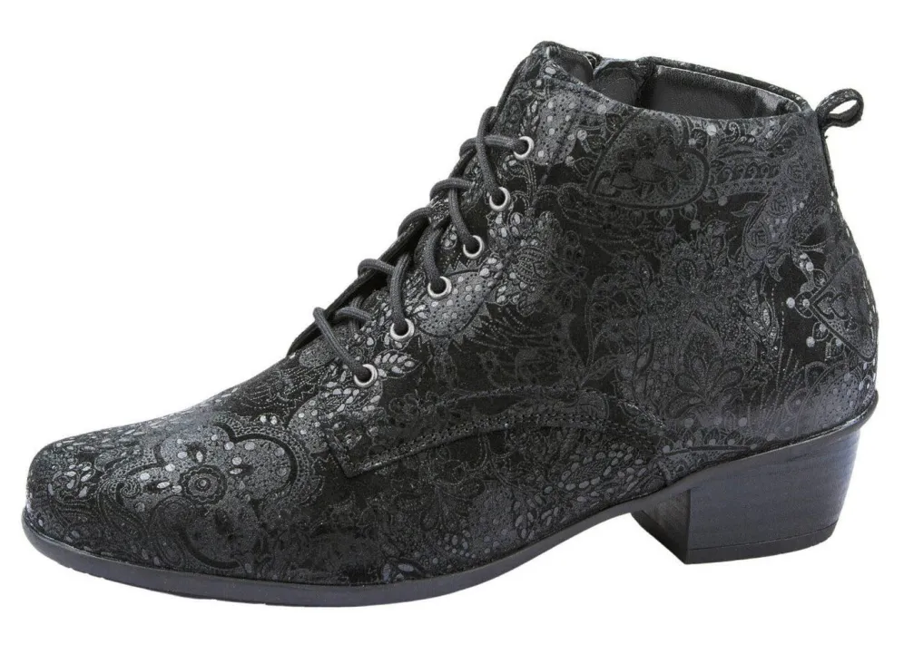 Schnür-Stiefelette aus hochwertigem Veloursleder mit zart schimmernder, floraler Prägung: in Weite H, praktischer Innenreißverschluss, angerautes Textilfutter, herausnehmbares Fußbett, TPU-Luftpolster-Profilsohle sowie 35 mm Absatz. Schafthöhe ca. 11 cm