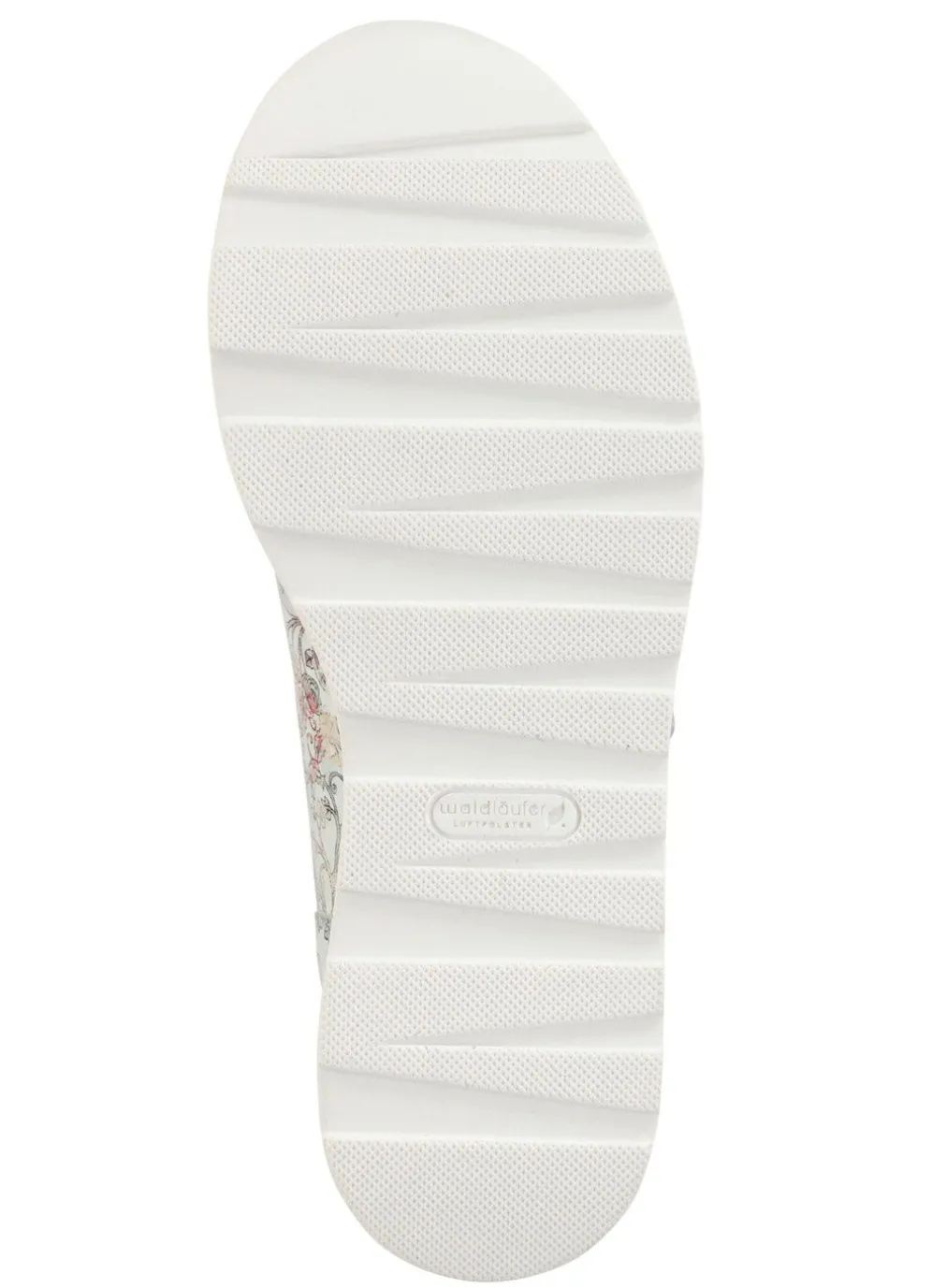 Sneaker in Eisblau-Bunt, aus floral bedrucktem, zart glänzendem Nubukleder: Weite H, Schnürung, Seitenreißverschluss, ledergefüttertes Quartier, herausnehmbares Lederfußbett, leichte PU-Luftpolster-Profilsohle mit Plateau, 20 mm Keilabsatz