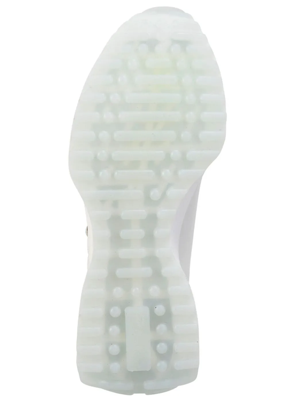 Nietenbesetzter Sneaker in Weiß-Eisgrau, aus Nappa-, Velours- und Lackleder: Weite H, Schnürung und Reißverschluss, ledergefüttertes Quartier, herausnehmbares Lederfußbett, TR-Luftpolster-Profilsohle sowie 15 mm Keilabsatz