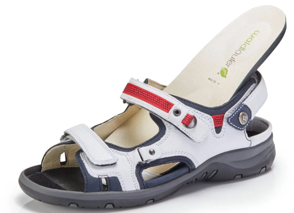 Sandalen aus Rind-Nubuk- oder Nappaleder, mit Textilbesätzen: Weite H, drei Klettspangen, Lederfutter, herausnehmbares Lederfußbett mit Fersenpolster, TR-Profilsohle, 20 mm Keilabsatz