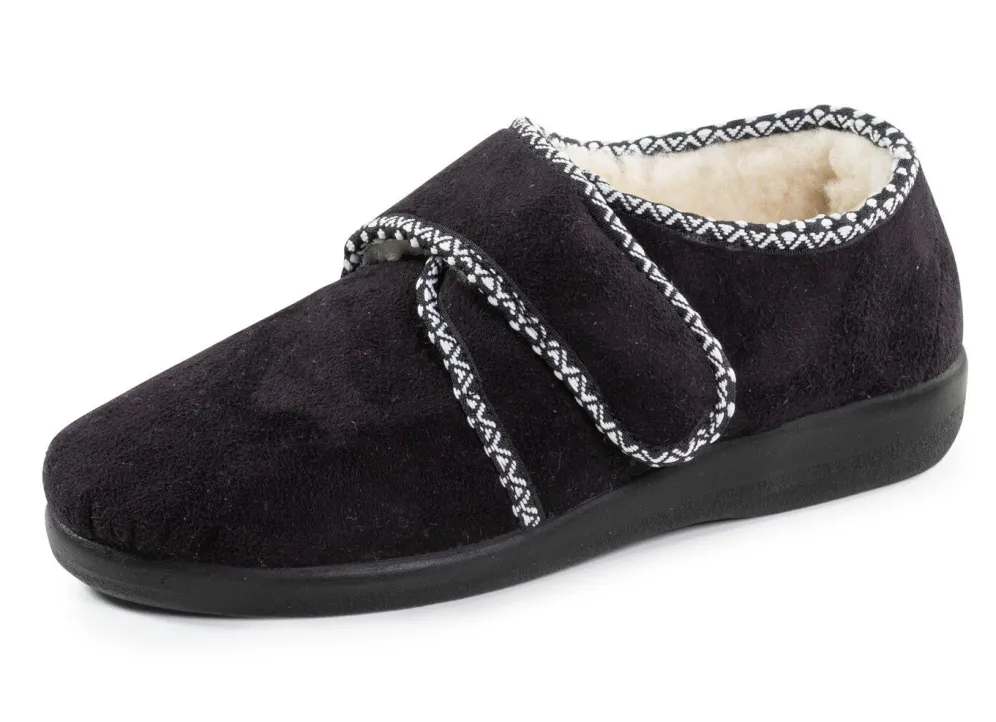Hausschuhe aus weichem Veloursmaterial mit flotter Bordüre: Weite H, verstellbare Klettspange, Warmfutter und Decksohlenbezug aus 100% Wolle, superleichte PU-Laufsohle sowie 15 mm Keilabsatz