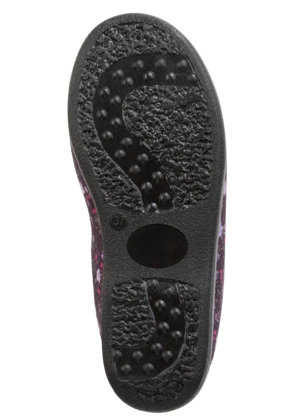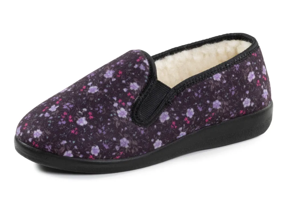 Mollige Hausschuhe aus floral bedrucktem, gepolstertem Textilmaterial: Weite H, seitliche Gummizüge, Warmfutter und Decksohle aus reiner Wolle, superleichte PU-Laufsohle, 15 mm Keilabsatz