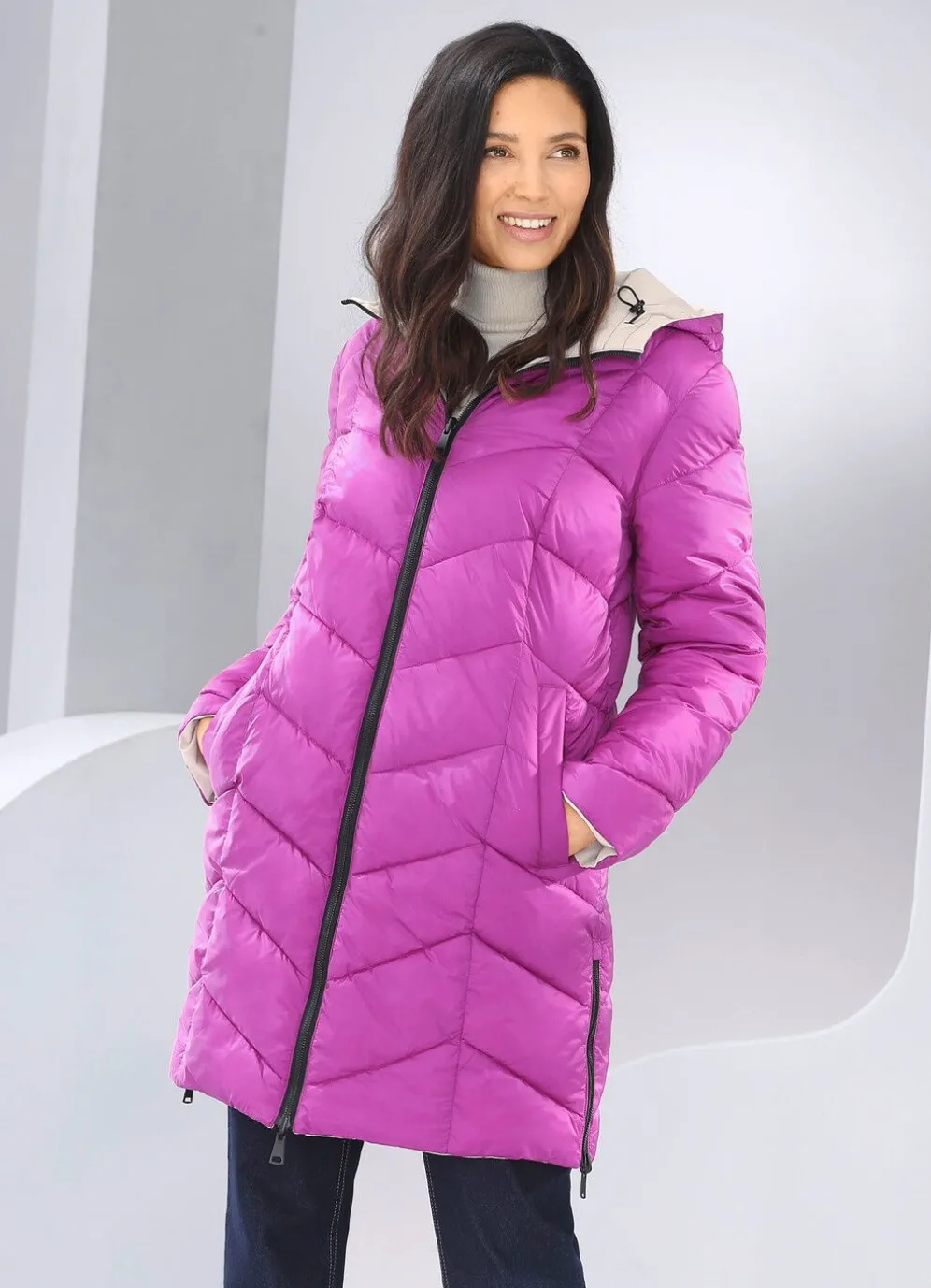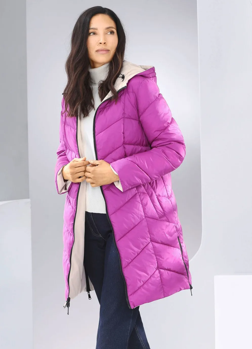 Ganz egal wie man ihn dreht und wendet. Dieser flippige Wende-Kurzmantel zeigt sich garantiert von seiner Schokoladenseite: Durchzugsband und Stopper an der festen Kapuze, durch 2-Wege-Reißverschluss hoch schließbarer Stehkragen sowie Reißverschluss an den Seitenschlitzen. Die gesteppte, pinkfarbene Seite zeigt Schubtaschen mit Blende und verdecktem Drucker, die ungesteppte Seite in Sand ist mit Reißverschlusstaschen gearbeitet. Länge ca. 90 cm, ab Gr. 40 ca. 92 cm, ab Gr. 46 ca. 94 cm.