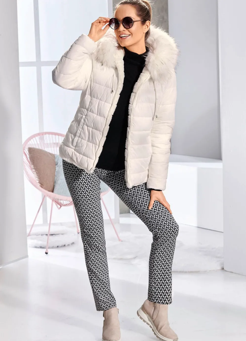 Superschicke Wendejacke mit Durchzugsband und abnehmbarem Kunstpelz-Besatz an der festen Kapuze sowie Reißverschlussleiste. Eine Seite in Naturweiß gesteppt und mit Schubtaschen, die andere cremefarbene Seite ist aus Kunstpelz und mit Reißverschluss-Paspeltaschen gearbeitet. Länge ca. 66 cm, ab Gr. 40 ca. 69 cm, ab Gr. 46 ca. 72 cm.