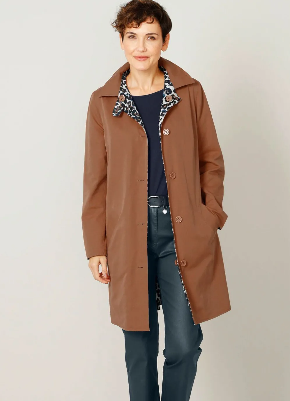 Kurzmantel mit Riegel und Knopf am Kragen, Knopfleiste, Schubtaschen mit breiter Blende, umschlagbaren Ärmeln jeweils in Kontrast sowie verdecktem Gehschlitz. Eine Seite in uni karamell, die andere, ecrufarbene Seite mit trendgenauem Animalprint in Schwarz-Karamell-Blau. Länge ca. 92 cm.