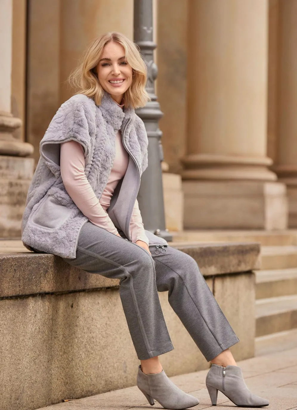 Silbergraue Weste von B/ANCA in attraktiver Zopfmuster-Optik: durch 2-Wege-Zipper hoch schließbarer Stehkragen, überschnittene Schultern sowie zwei aufgesetzte Taschen.