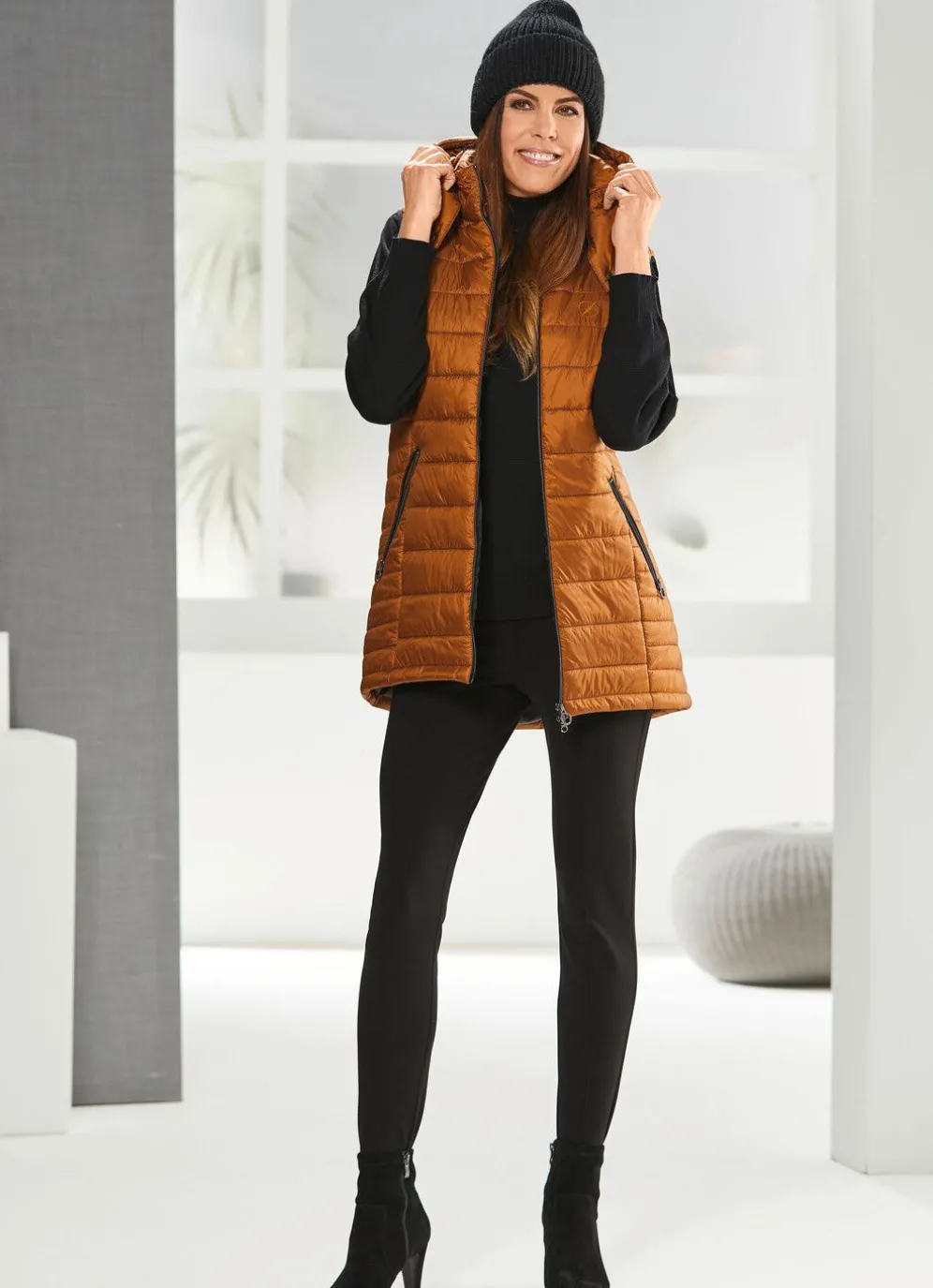 Perfekt und absolut modisch ist diese mandelfarbene Weste mit Durchzugsband, Stopper und Riegel mit Druckern an der abnehmbaren Kapuze, durch 2-Wege-Reißverschluss hoch schließbarem Stehkragen, Reißverschlusstaschen, schwarzem Elastikbändchen an den Armausschnitten, einer Innentasche sowie leicht verlängertem, abgerundetem Rückteil, Länge ca. 84 cm.