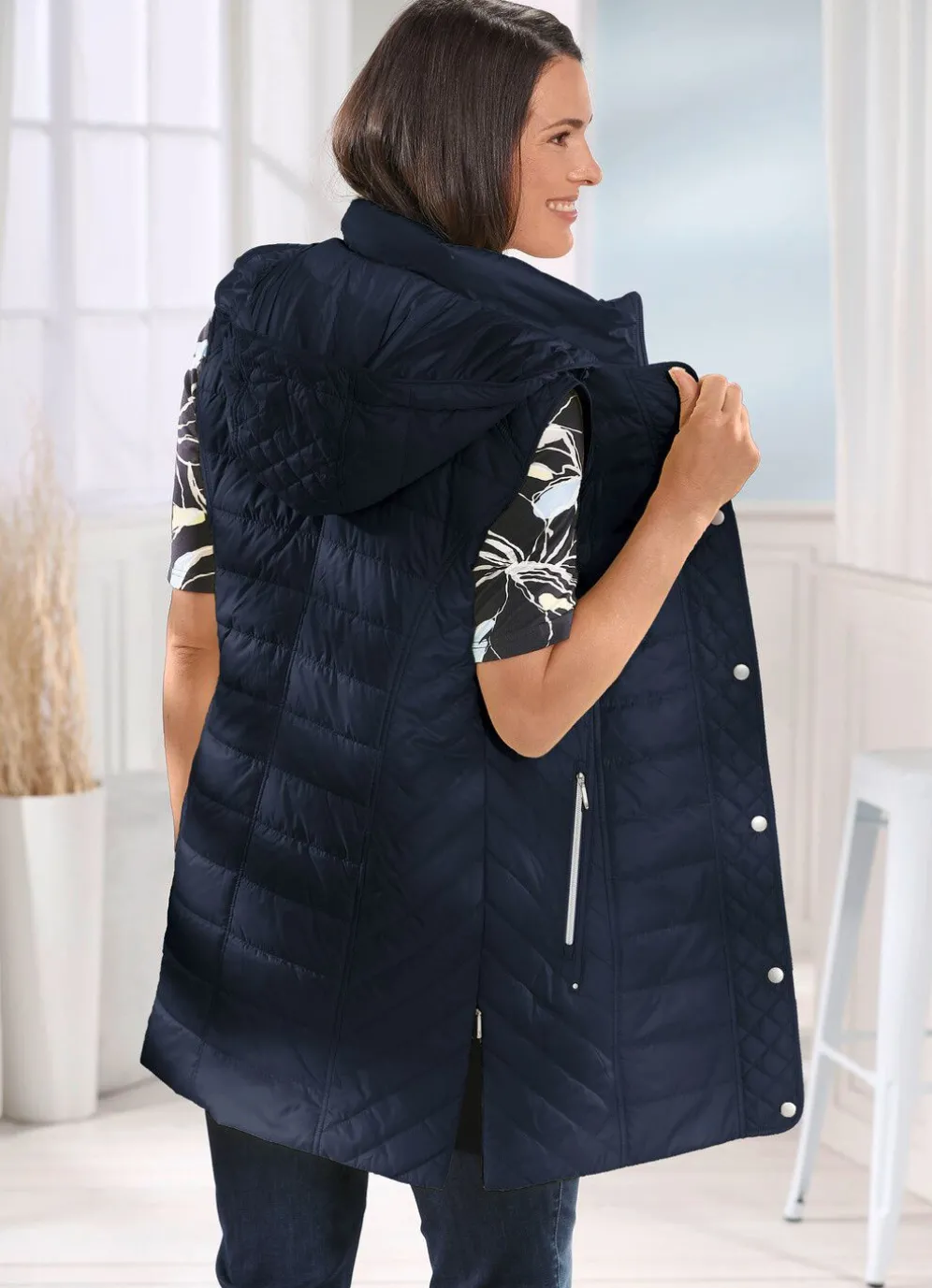 Ein modisches Glanzstück ist diese charmante Weste mit verschiedenen Steppvarianten: Durchzugsband und Stopper in der abnehmbaren Kapuze, durch Reißverschluss unter der Druckerleiste hoch schließbarer Stehkragen, Reißverschluss an den Taschen und Seitenschlitzen sowie eine Innentasche. Länge ca. 80 cm, ab Gr. 46 ca. 82 cm, bei K-Gr. ca. 76 cm, ab Gr. 23 ca. 78 cm.
