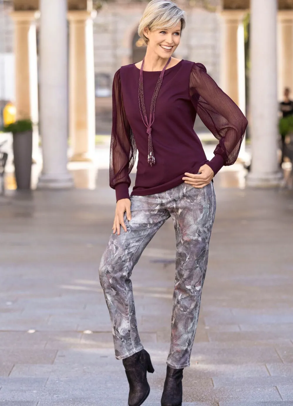 Wunderschön dessinierte Hose von laurakent: 5-Pocket-Form, elastischer Formbund, Gürtelschlaufen, Knopf- und Reißverschluss sowie figurformende Passe im Rückteil. Innenbeinlänge ca. 78 cm, Fußweite ab 34 cm.