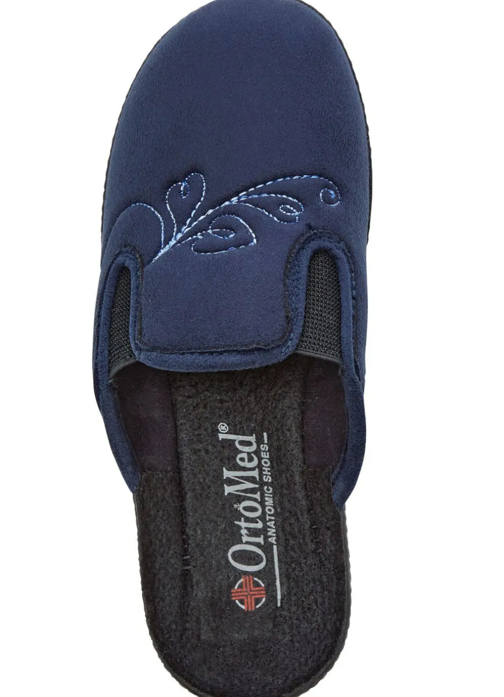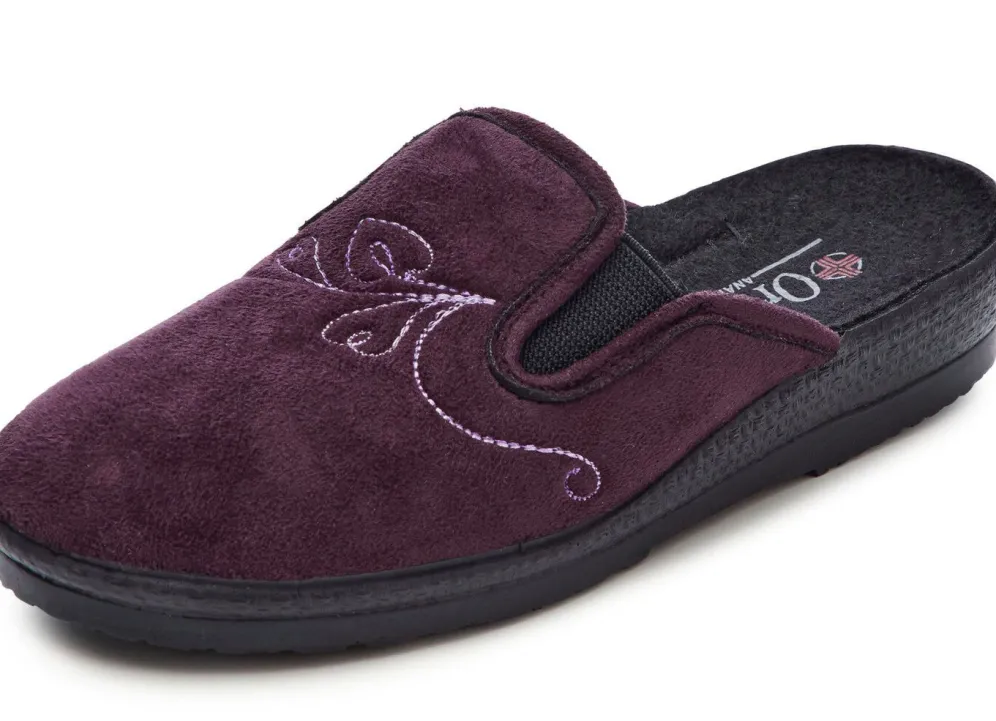 Hausschuhe aus weichem, besticktem Veloursmaterial: Weite H, zwei seitliche Gummizüge, gepolstertes Futter und Fußbettbezug aus Textil, superleichte PU-Laufsohle sowie 25 mm Keilabsatz