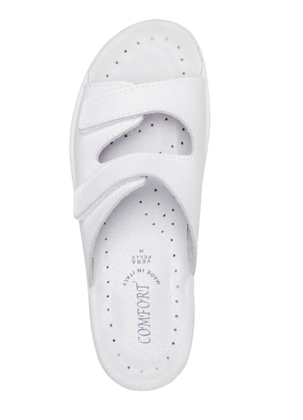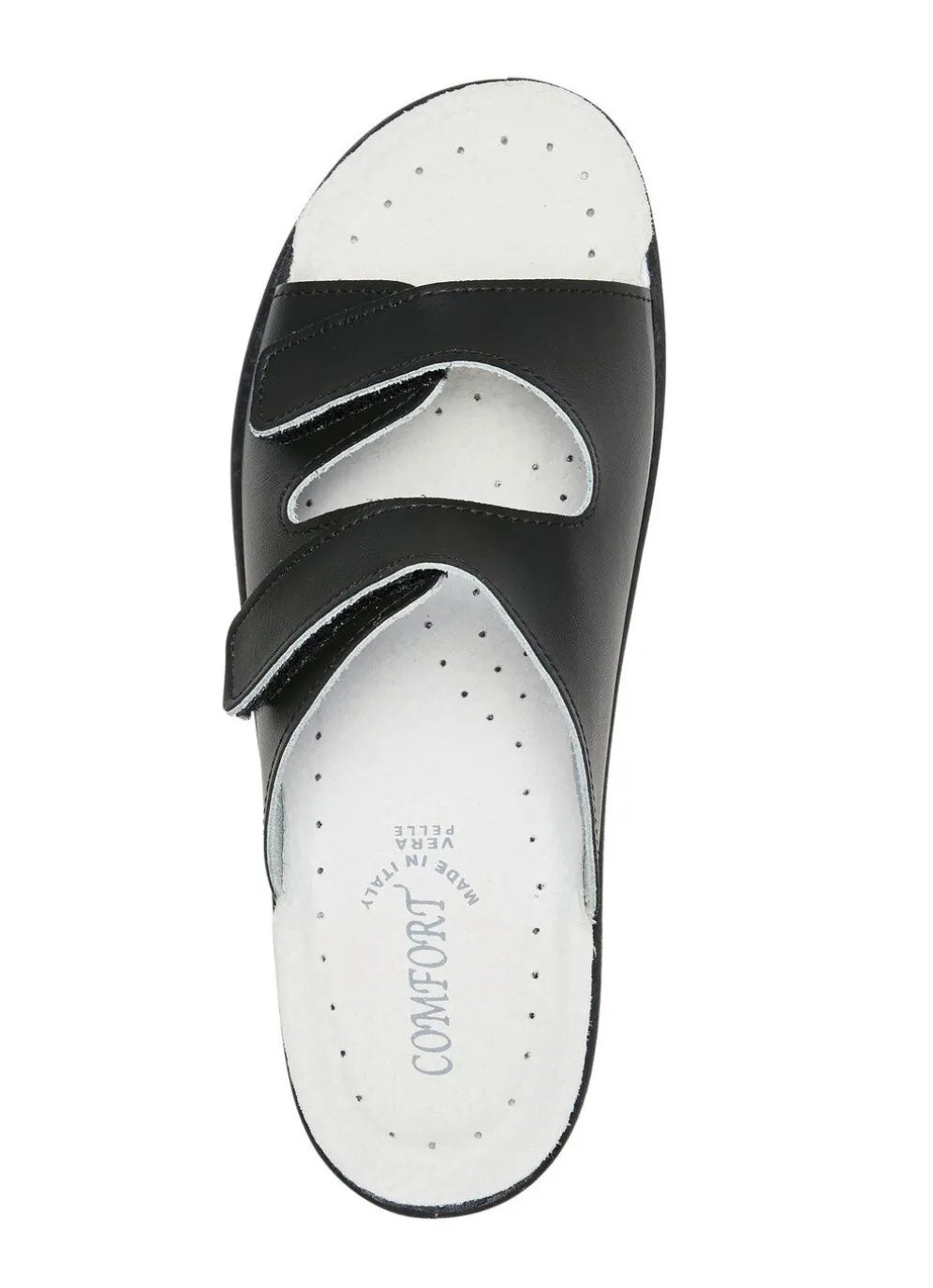 Pantoletten aus Nappaleder: in Weite H, zwei verstellbare Klettspangen, gepolstertes Lederfußbett, PU-Laufsohle sowie 30 mm Keilabsatz
