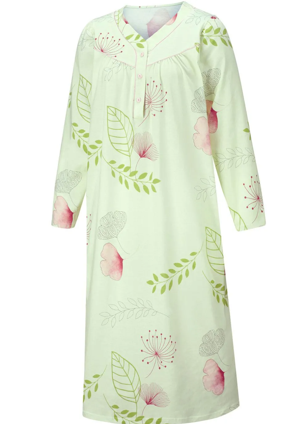 Preisgünstiger Zweierpack bestehend aus einem allover dessinierten und einem uni, wadenlangen Nachthemd mit Paspeln, Knopfleiste, Vorderpasse sowie Raffungen vorne und am Ansatz der ¾-langen Ärmel.