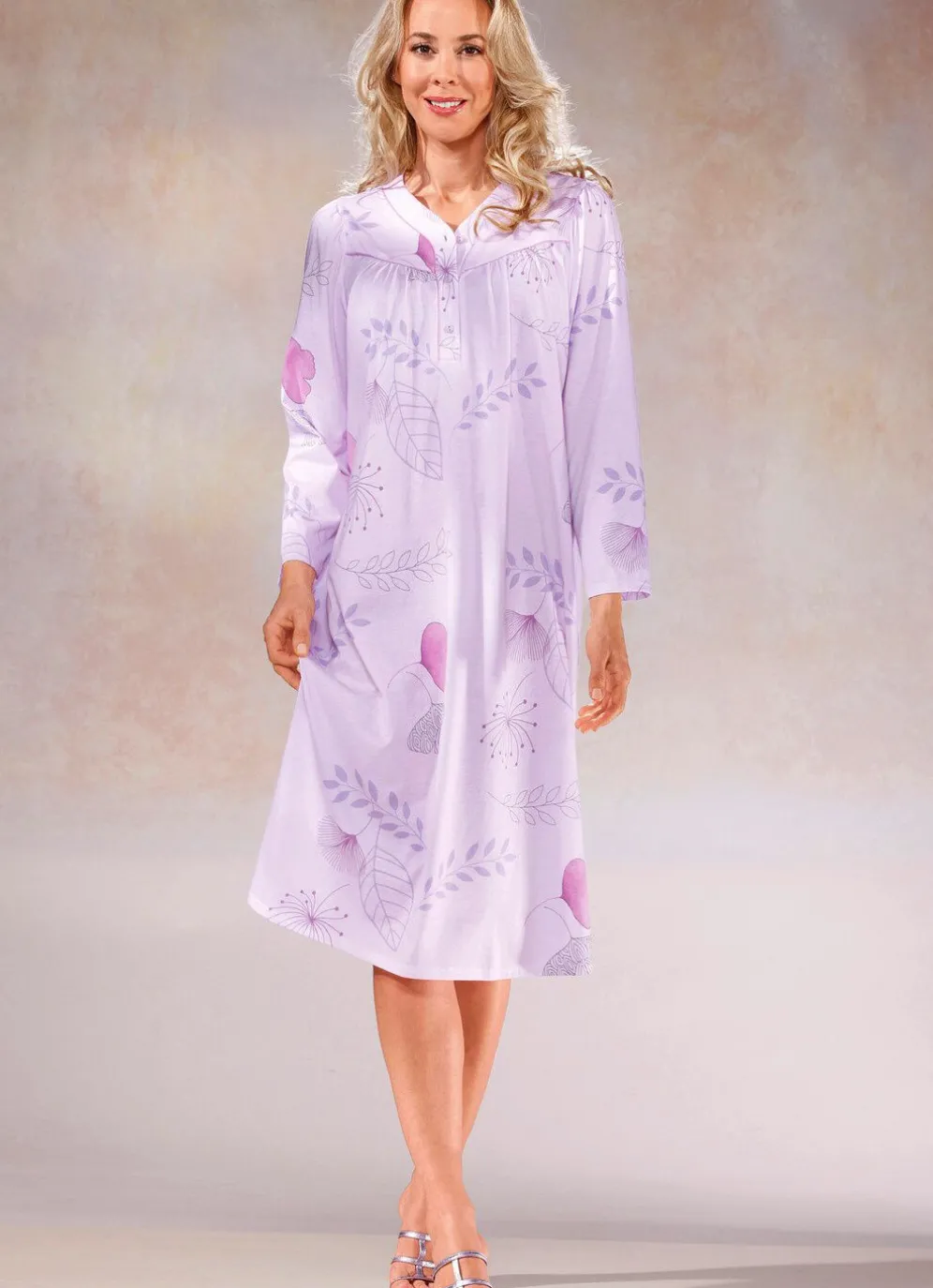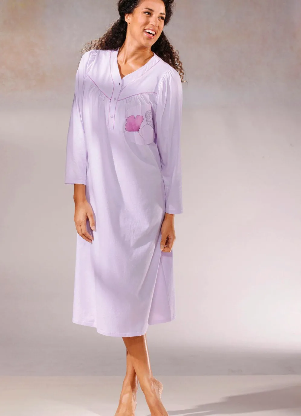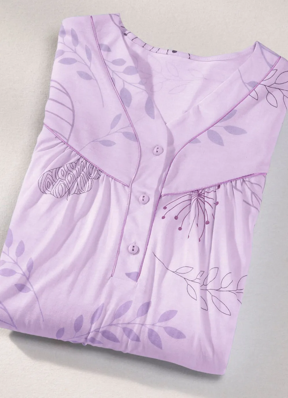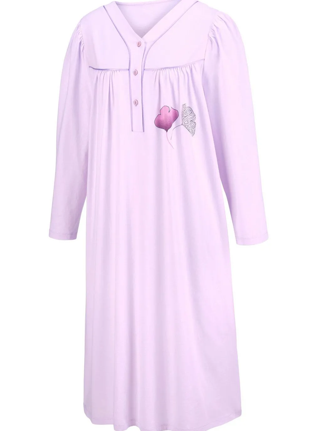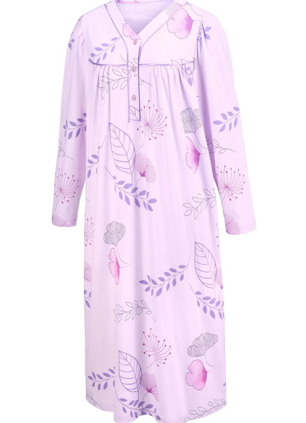 Preisgünstiger Zweierpack bestehend aus einem allover dessinierten und einem uni, wadenlangen Nachthemd mit Paspeln, Knopfleiste, Vorderpasse sowie Raffungen vorne und am Ansatz der ¾-langen Ärmel.