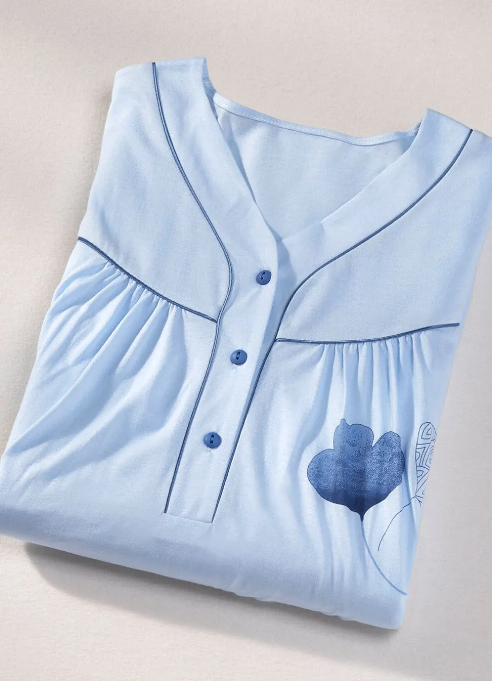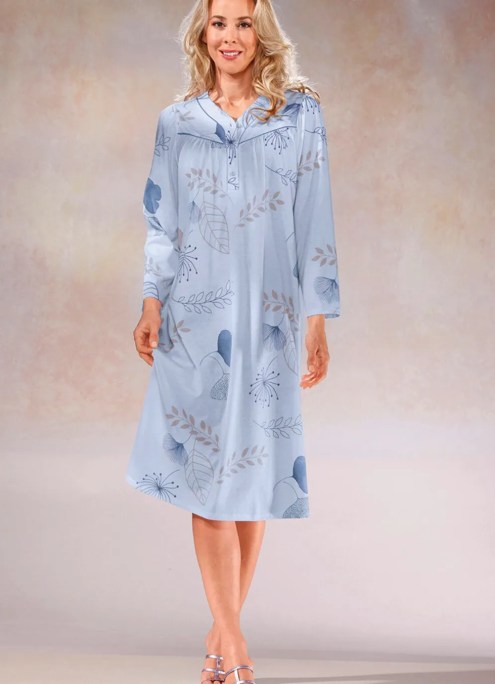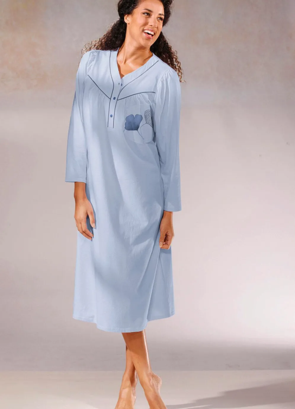 Preisgünstiger Zweierpack bestehend aus einem allover dessinierten und einem uni, wadenlangen Nachthemd mit Paspeln, Knopfleiste, Vorderpasse sowie Raffungen vorne und am Ansatz der ¾-langen Ärmel.