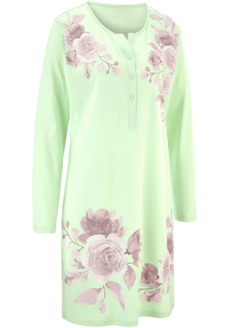 langer Knopfleiste, platzierten Drucken im Vorderteil sowie langen Ärmeln.