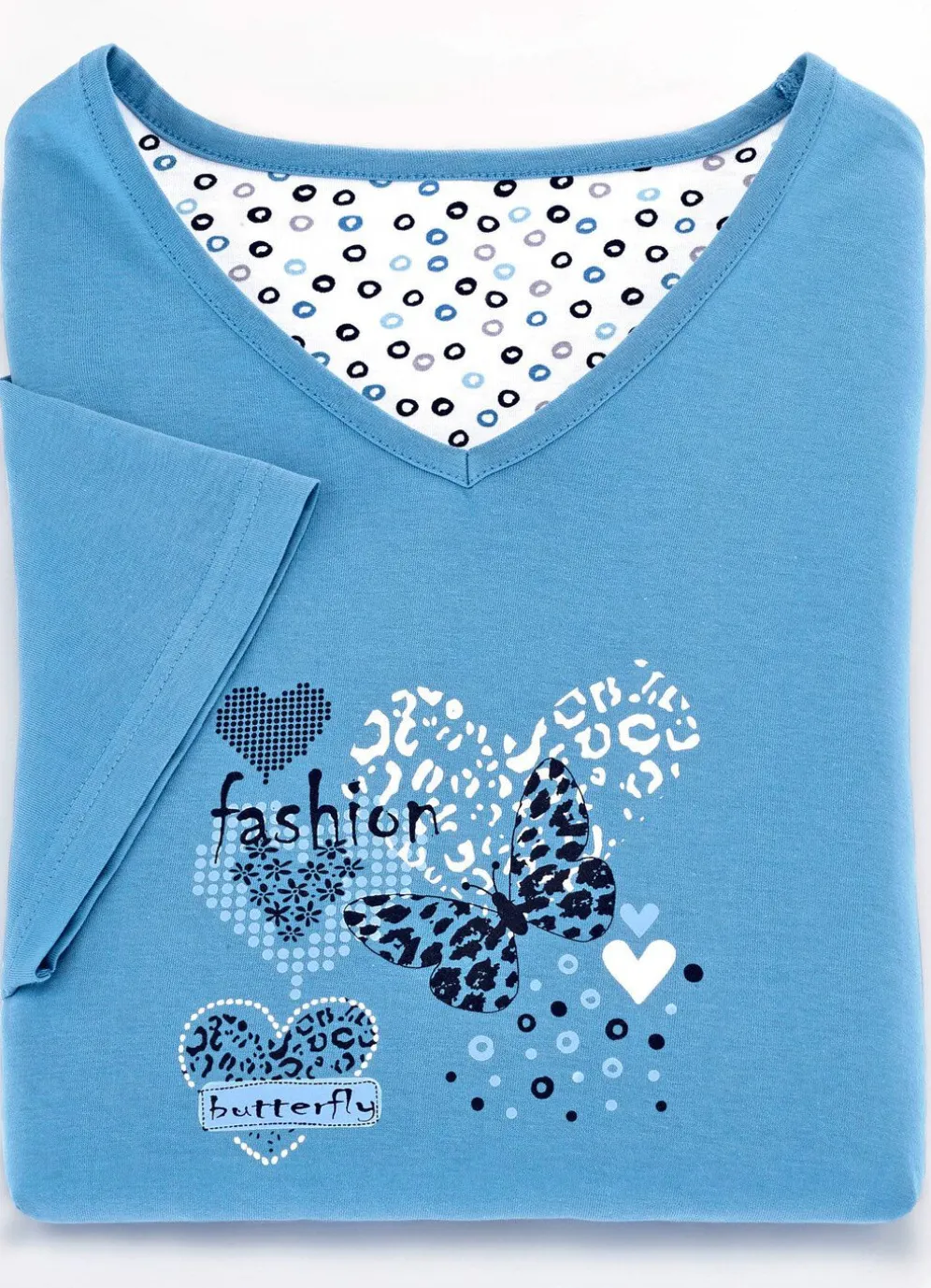 V-Ausschnitt, platzierter Druck im Vorderteil sowie innerer Rückensattel.