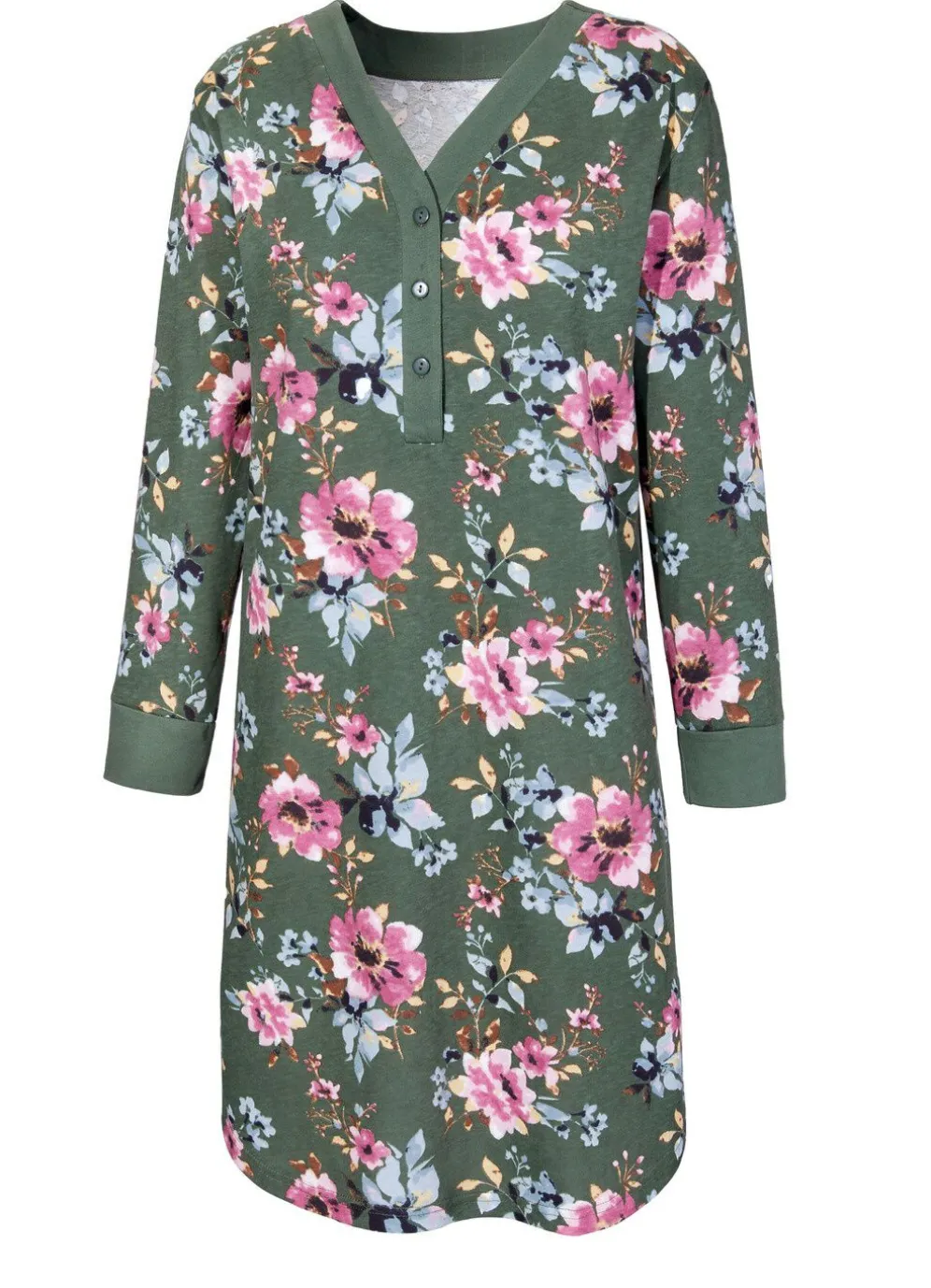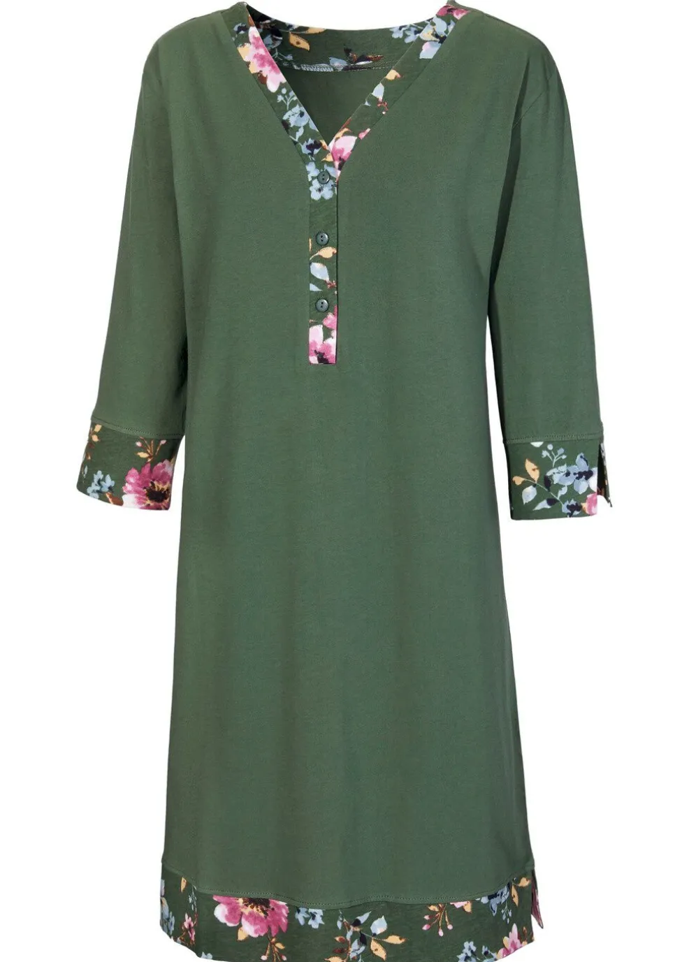 Zweierpack kürzer geschnittene Nachthemden mit Knopfleiste und Blenden: Uni Modell mit seitlichen Schlitzen am Saum und an den 3/4 -langen Ärmeln mit Blendenabschlüssen. Bedrucktes Modell mit Bündchenabschlüssen an den langen Ärmeln sowie abgerundetem Saum.