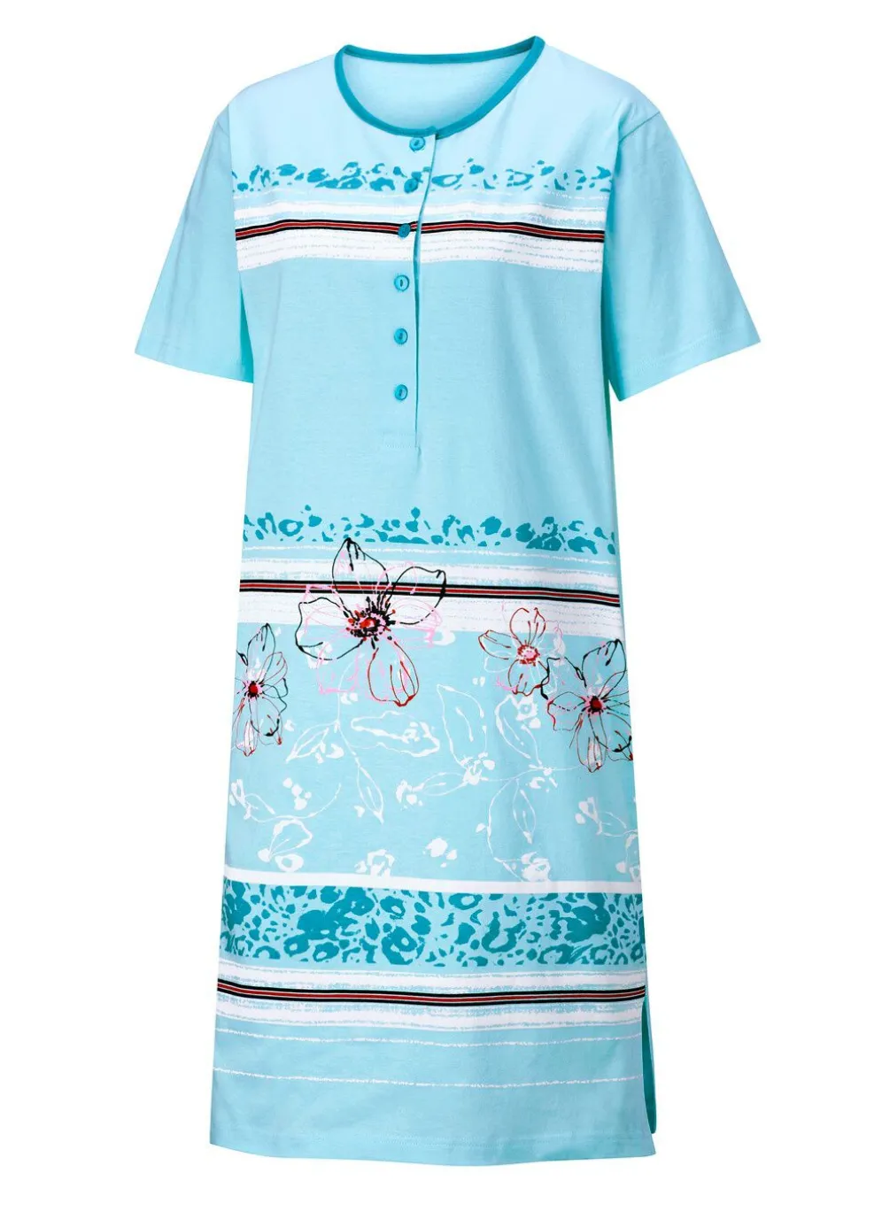 Knielanges Nachthemd im preiswerten Zweierpack: Einfassung am Halsausschnitt, lange Knopfleiste, platzierter Druck vorne, kurze Ärmel sowie seitliche Schlitze am Saum.