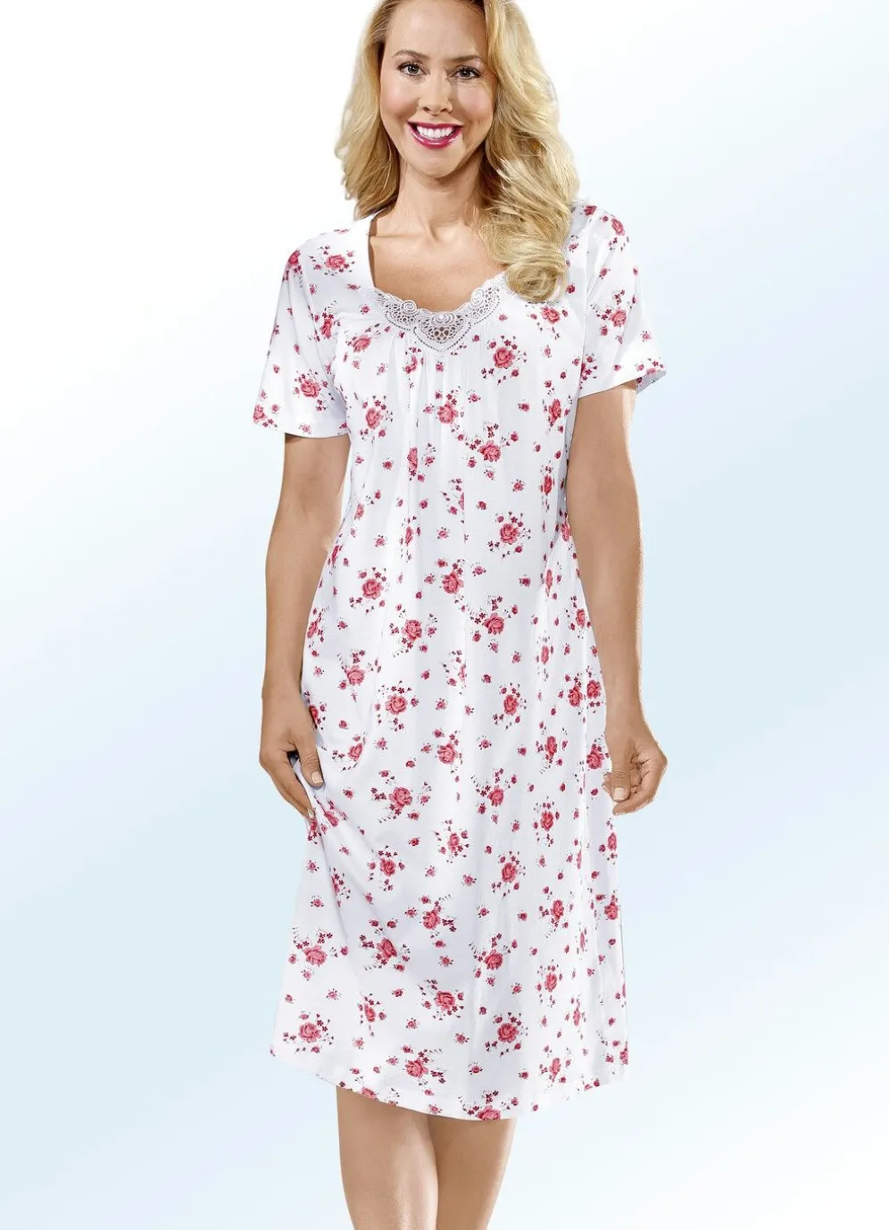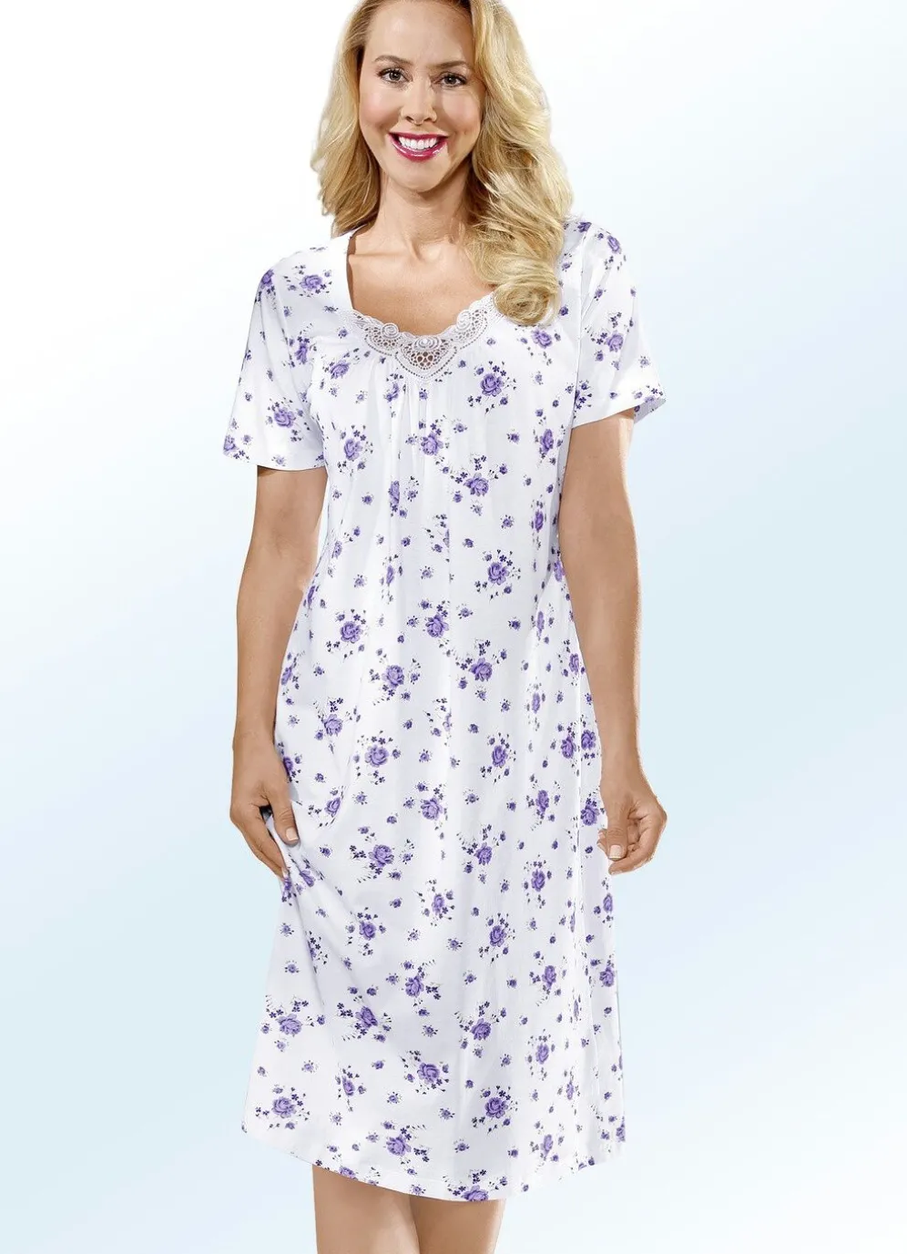 Im preisgünstigen Zweierpack bieten wir Ihnen dieses wadenlange Nachthemd an: Es zeigt eine hübsche Stickereispitze am Carreeausschnitt, Raffungen, kurze Ärmel sowie einen inneren Rückensattel.
