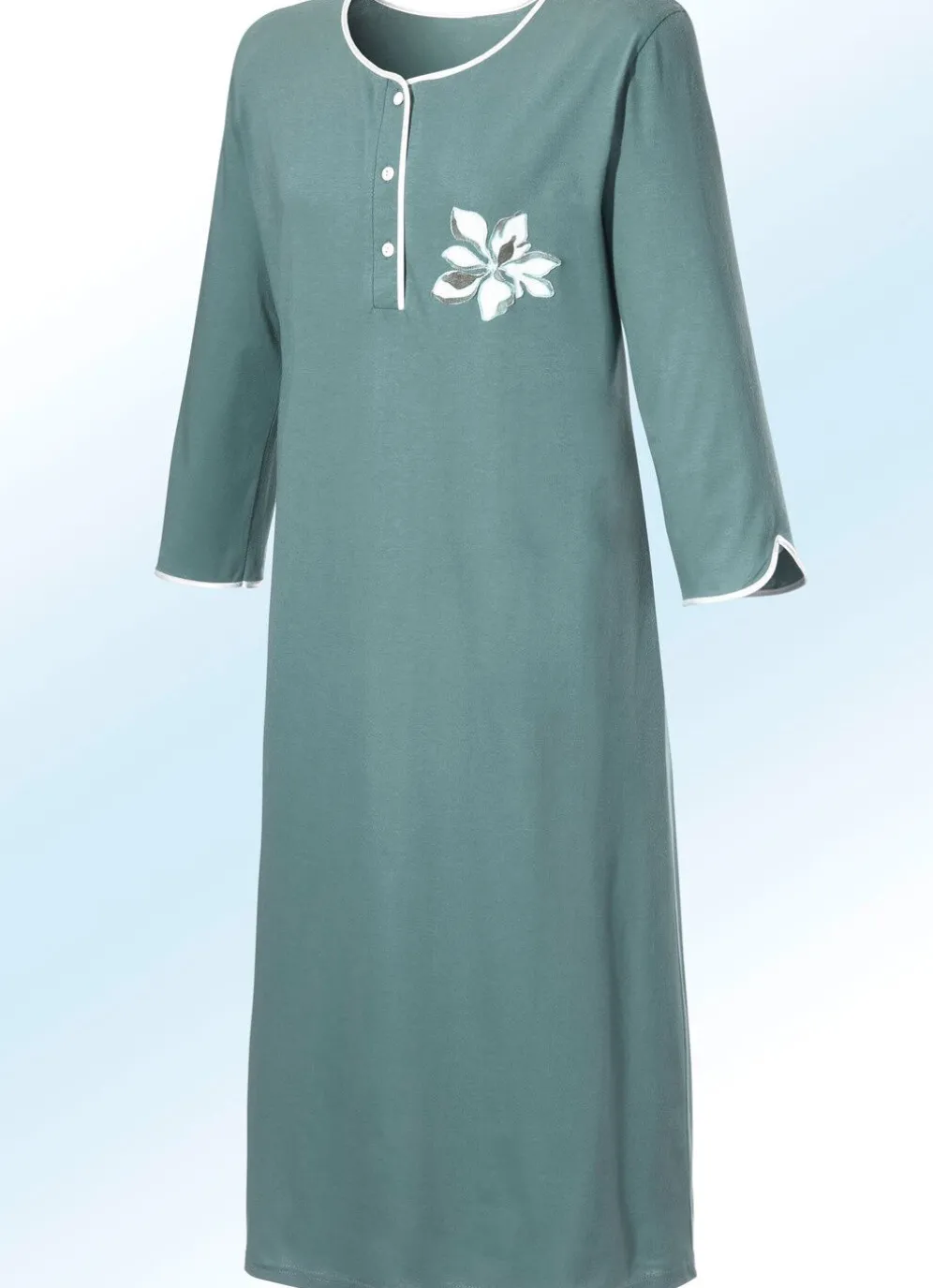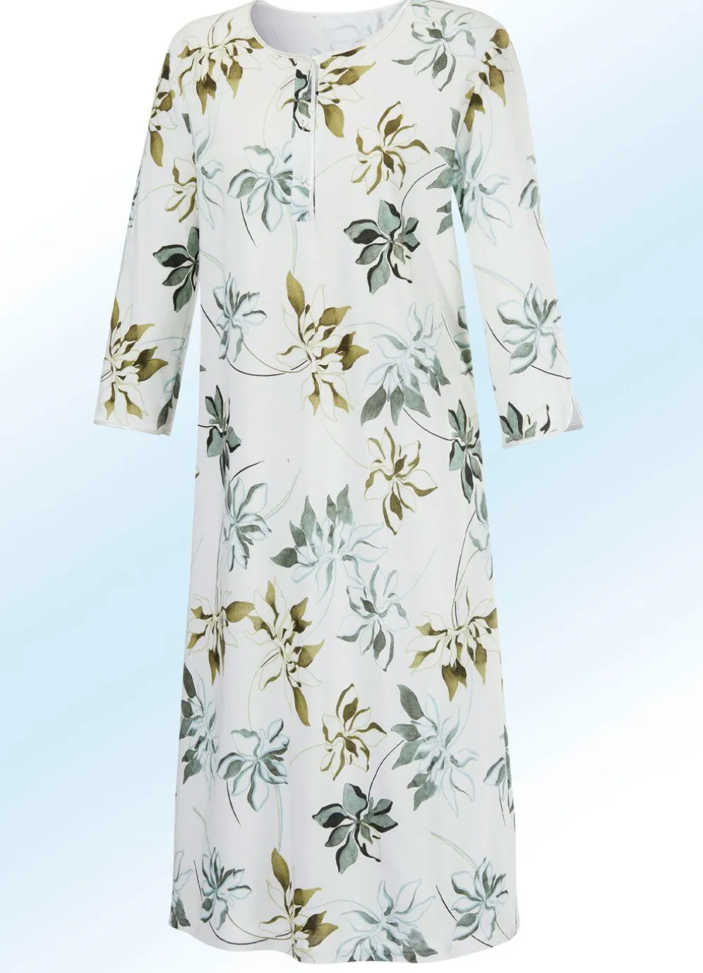 Im preisgünstigen Zweierpack bieten wir Ihnen diese wadenlangen Nachthemden an, bestehend aus einem uni Nachthemd mit platziertem Druck sowie einem allover dessinierten Modell, beide mit Satinbandeinfassung an Ausschnitt, Knopfleiste sowie abgerundetem Schlitz an den 3/4-langen Ärmeln.