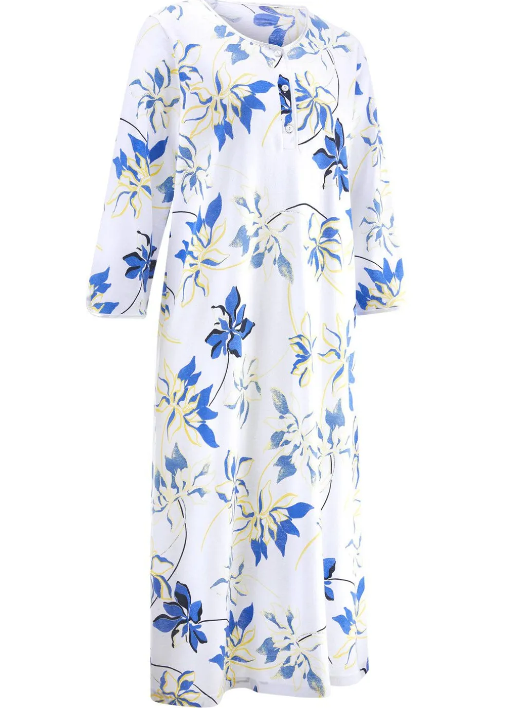 Im preisgünstigen Zweierpack bieten wir Ihnen diese wadenlangen Nachthemden an, bestehend aus einem uni Nachthemd mit platziertem Druck sowie einem allover dessinierten Modell, beide mit Satinbandeinfassung an Ausschnitt, Knopfleiste sowie abgerundetem Schlitz an den 3/4-langen Ärmeln.