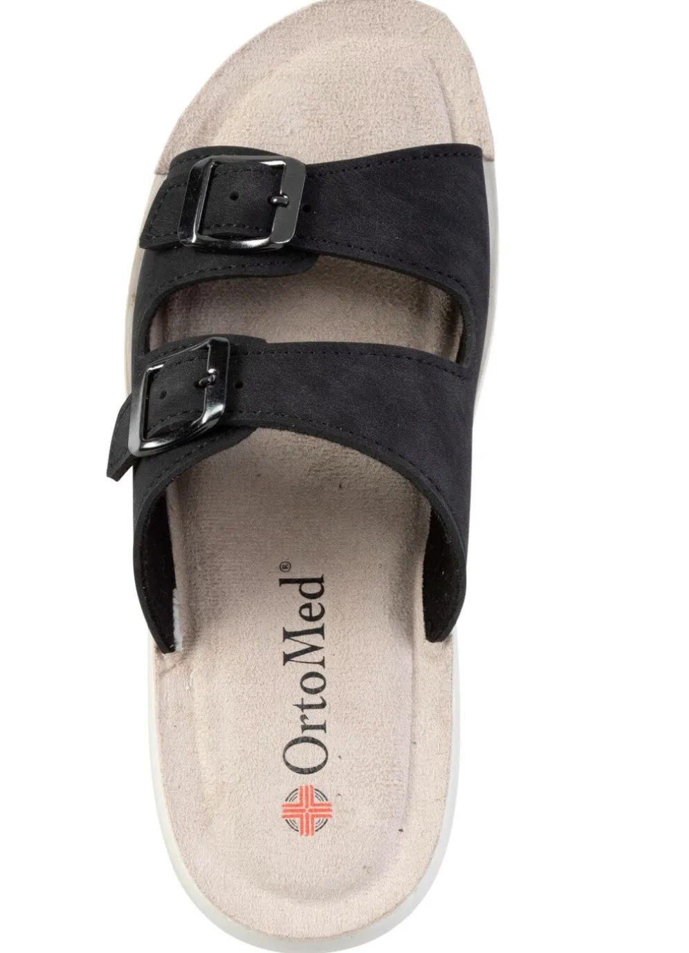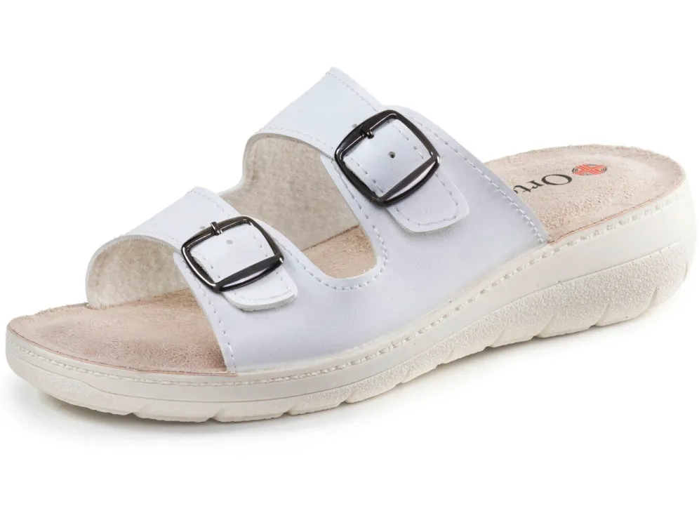 Pantolette aus Nubuk- und Nappasynthetik: Weite H, zwei verstellbare Schließen, Textilfutter, gepolsterte Decksohle, PU-Laufsohle, 30 mm Keilabsatz
