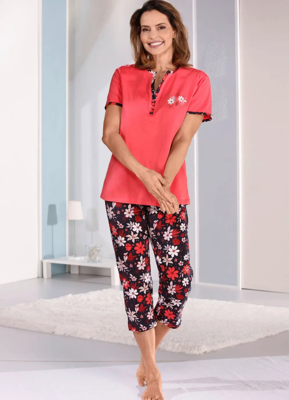 Attraktiver Zweierpack! Schlafanzüge von „Comtessa“ in Koralle-Schwarz-Bunt: Oberteile mit