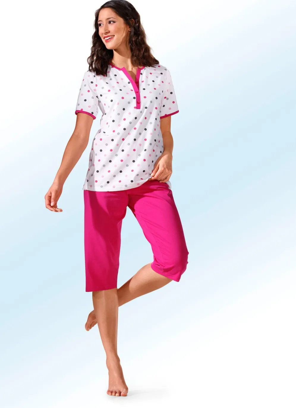 Attraktiver Zweierpack Schlafanzüge: Die Oberteile sind mit langen oder kurzen Ärmeln sowie Kontrasteinfassungen und Knopfleiste gearbeitet. Dazu erhalten Sie eine lange und eine wadenlange Hose mit Dehnbund sowie offenen Beinabschlüssen.