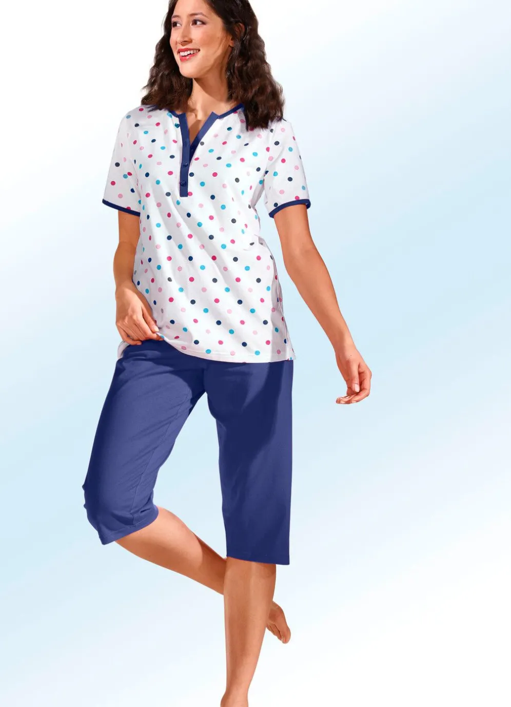 Attraktiver Zweierpack Schlafanzüge: Die Oberteile sind mit langen oder kurzen Ärmeln sowie Kontrasteinfassungen und Knopfleiste gearbeitet. Dazu erhalten Sie eine lange und eine wadenlange Hose mit Dehnbund sowie offenen Beinabschlüssen.