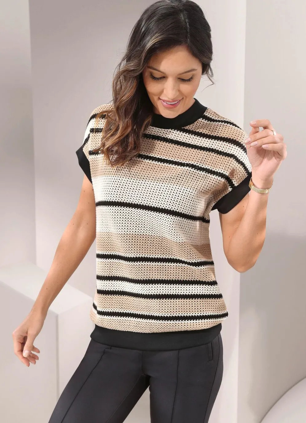 Außergewöhnliches 2-in-1 Shirt von TIZIA mit Netzstruktur in Wollweiß-Sand-Schwarz, Pailletten-Stickereien im Vorderteil und Kontrastblenden in Schwarz am Rundhalsausschnitt und Armsäumen, mit überschnittenen Ärmeln und einknöpfbarem Top in Schwarz mit verstellbaren Trägern – auch einzeln tragbar.