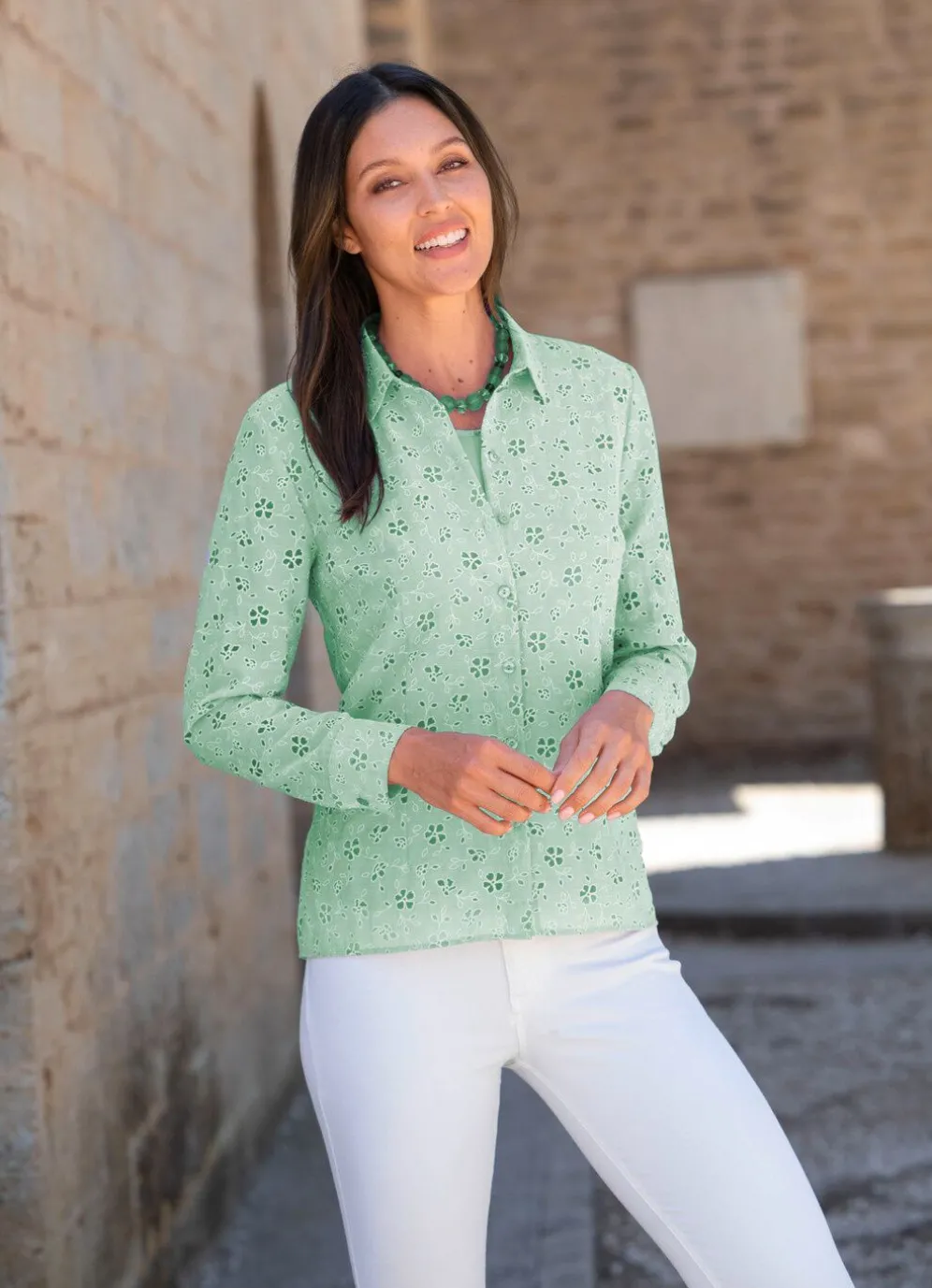 Bluse: Ausbrennergewebe, 74% Viskose, 26% Polyamid; Top: Elastischer Feinjersey, 95% Viskose, 5% Elasthan